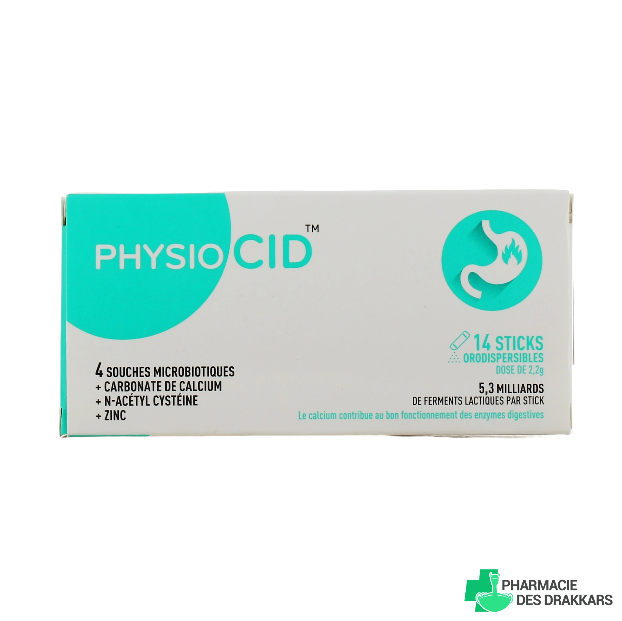 PhysioCID contient 4 souches microbiotiques différentes, dosées à 10,6 milliards pour 2 sticks. PhysioCID contient également de la N-acétyl-cystéine, du carbonate de calcium qui contribue au bon fonctionnement des enzymes digestives, et du zinc qui participe au maintien du métabolisme acido-basique normal.