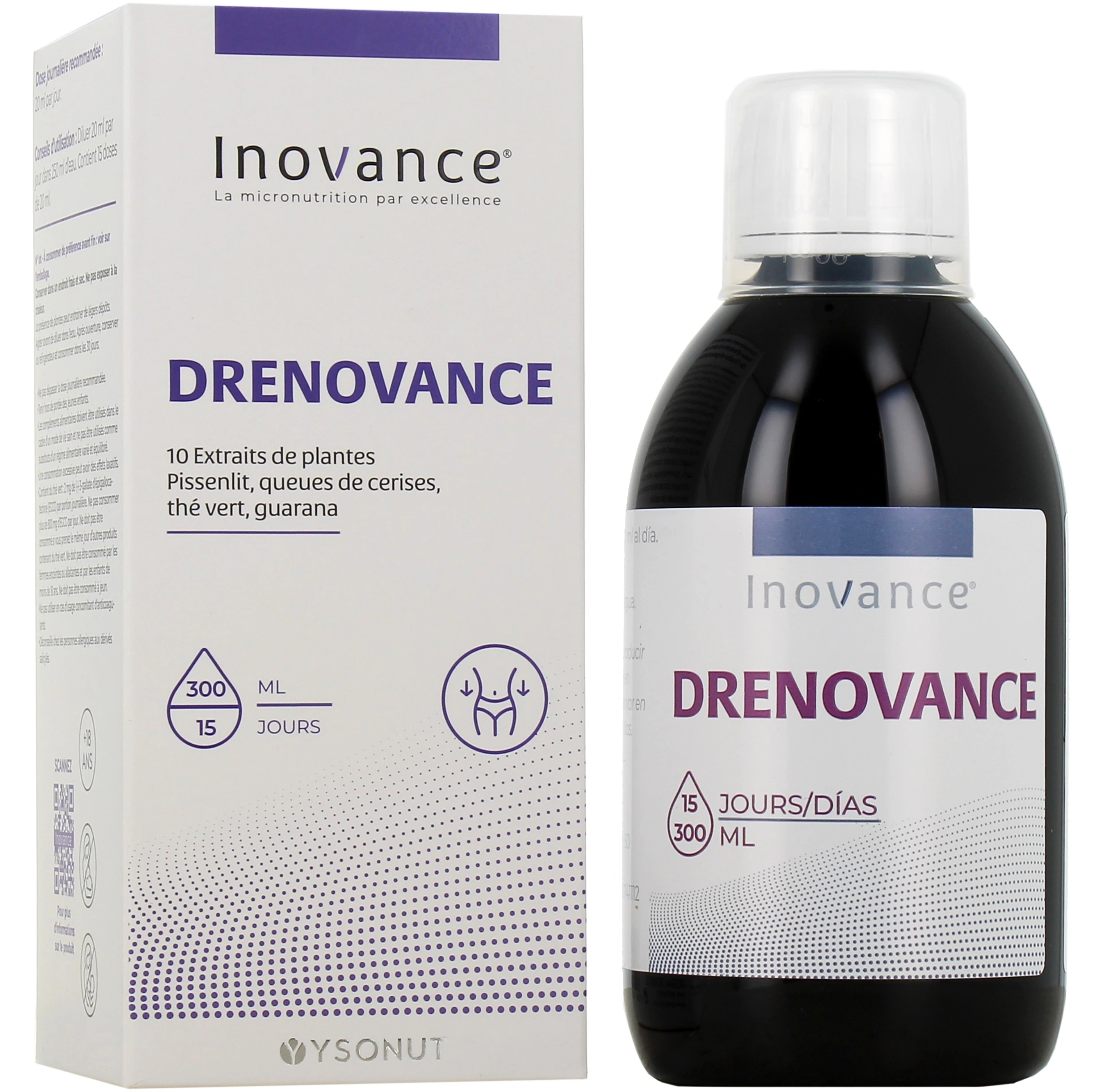 Le complément alimentaire Inovance Drenovance se présente sous la forme d'une solution buvable aux 10 extraits de plantes (notamment pissenlit, queues de cerises, thé vert et guarana), à diluer dans de l'eau, pour aider à éliminer.