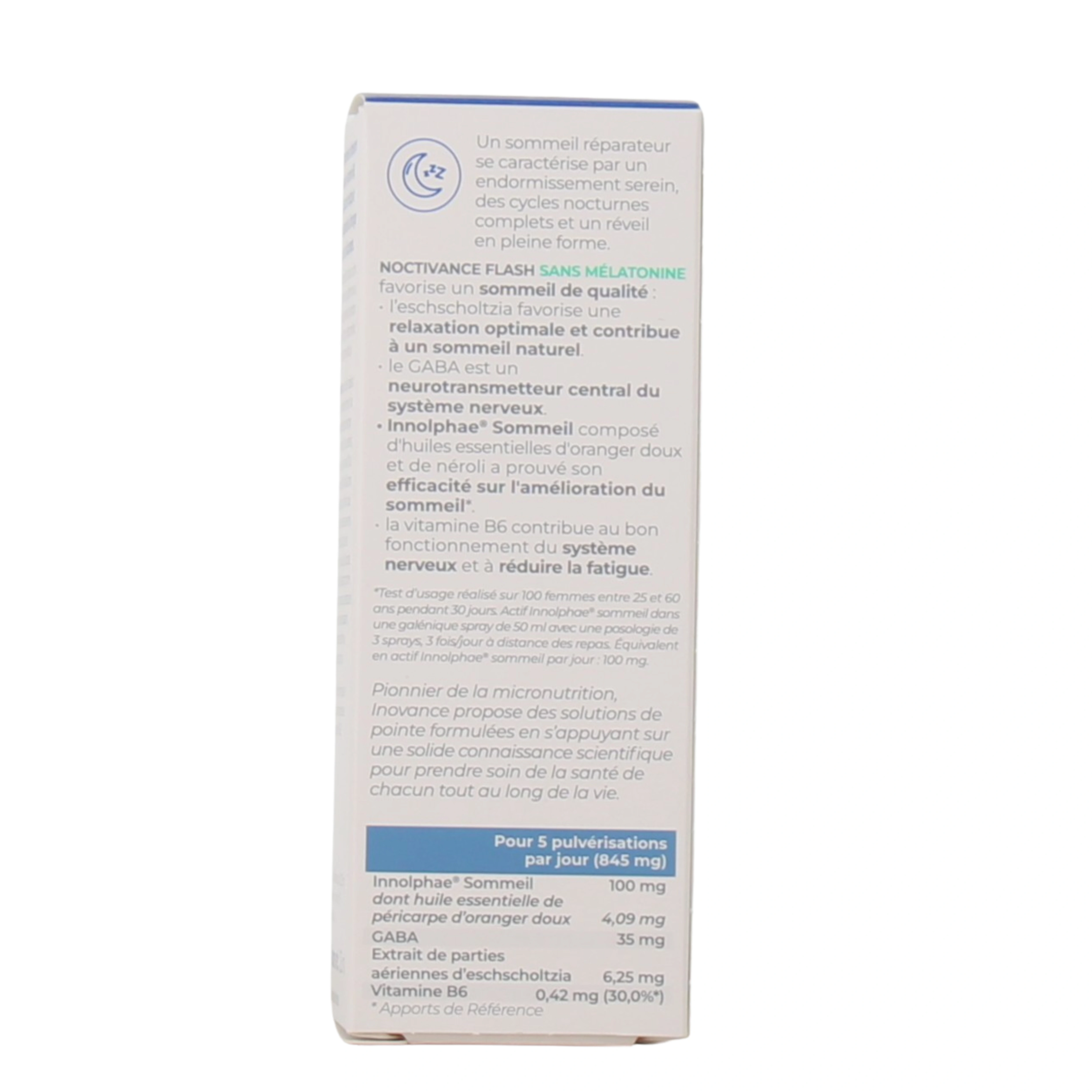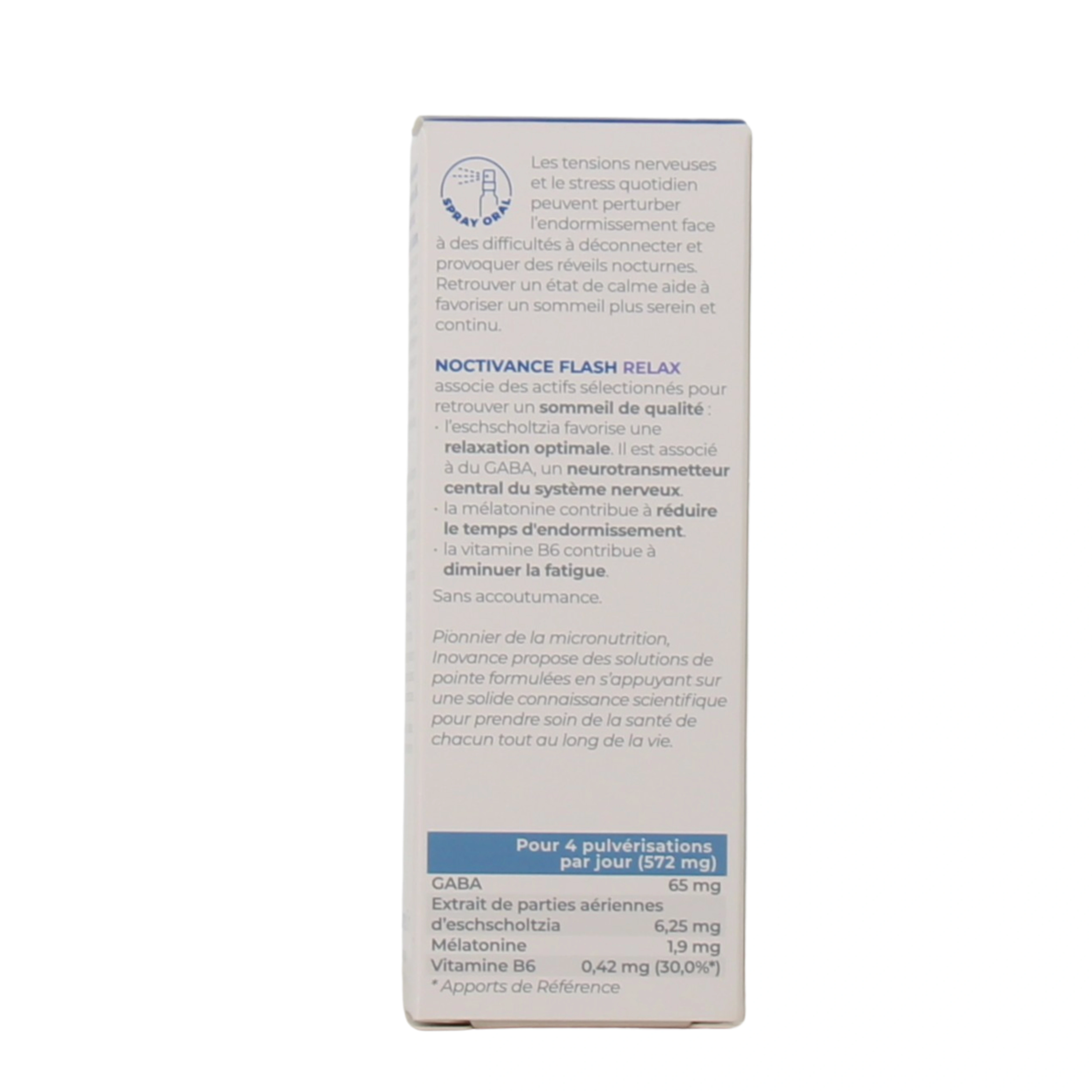 Inovance Noctivance Flash est un complément alimentaire réservé à l'adulte. Il est indiqué d'effectuer 5 pulvérisations (soit 0,75 ml) de spray sans mélatonine ou 4 pulvérisations (soit 0,52 ml) de spray relax dans la bouche, 30 minutes avant le coucher ou en cas de réveil nocturne. Agitez avant utilisation. Précautions d'emploi :- Ne pas dépasser la dose journalière recommandée.