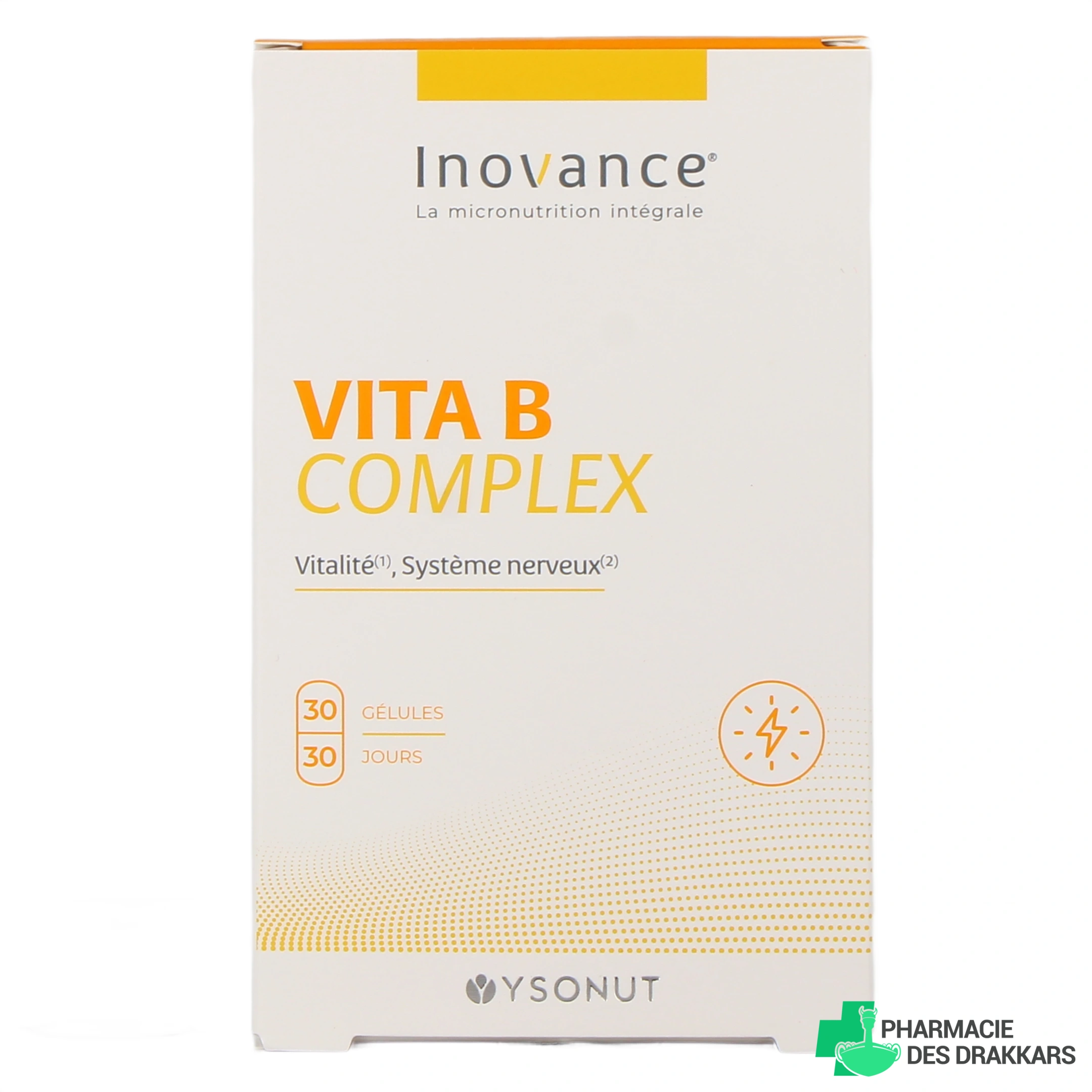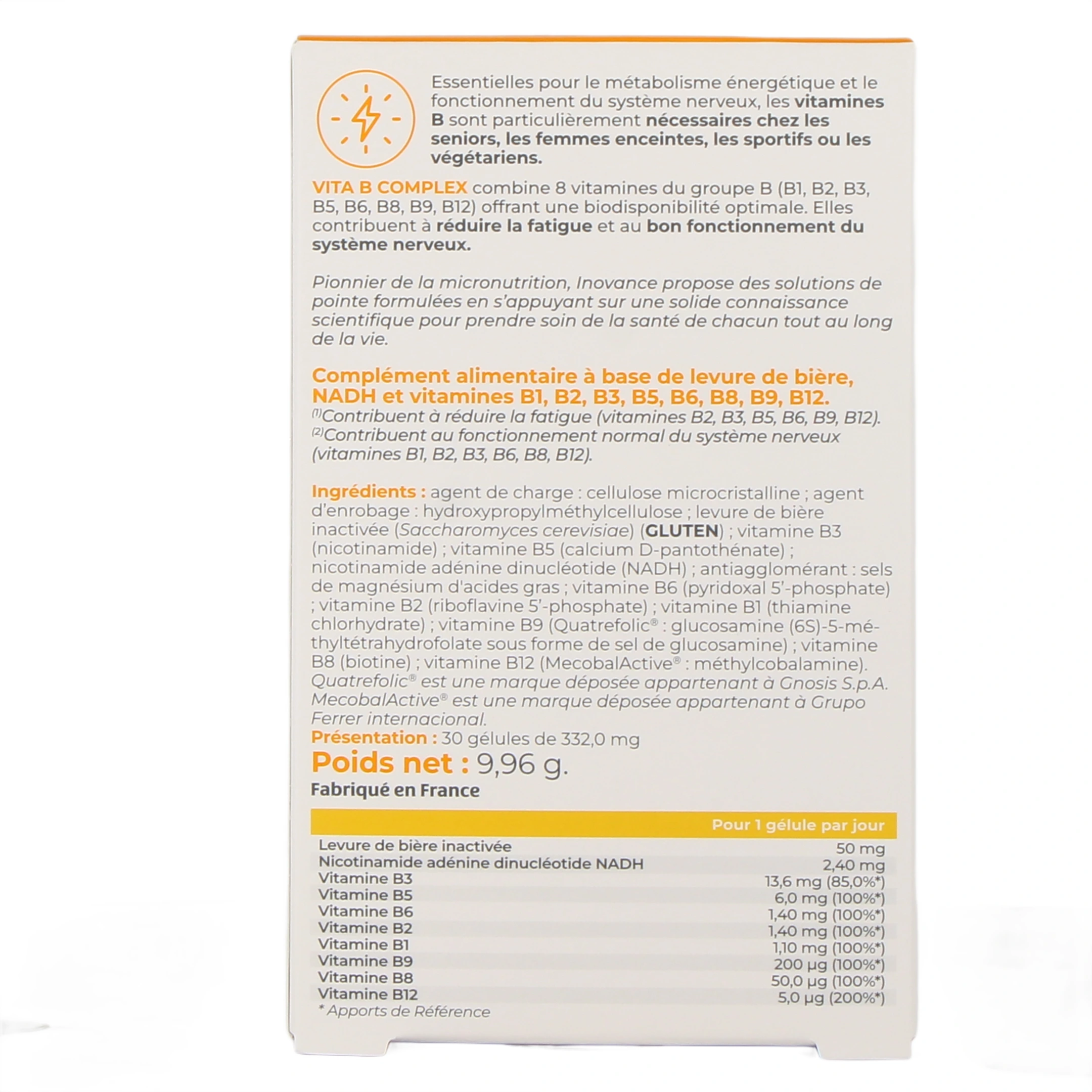Fabriqué en France, et mis au point par le laboratoire Ysonut, le complément alimentaire Inovance Vita B Complex combine 8 vitamines du groupe B (B1, B2, B3, B5, B6, B8, B9 et B12) offrant une biodisponibilité optimale. Elles contribuent à réduire la fatigue et au bon fonctionnement du système nerveux. Les gélules d'Inovance Vita B Complex peuvent être utilisées chez l'adulte et l'enfant de plus de 7 ans, mais également chez la femme enceinte ou allaitante (après avoir pris conseil auprès d'un professionnel de santé).