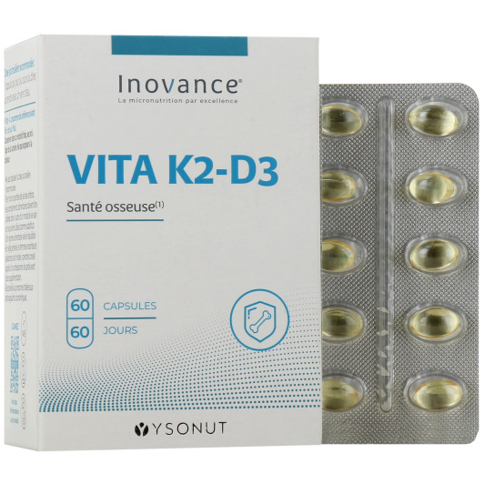 Inovance Vita K2-D3 est un complément alimentaire pour la santé osseuse. Sa formule associe de la vitamine K2 et de la vitamine D3 pour préserver le capital osseux et également soutenir la santé cardiovasculaire.