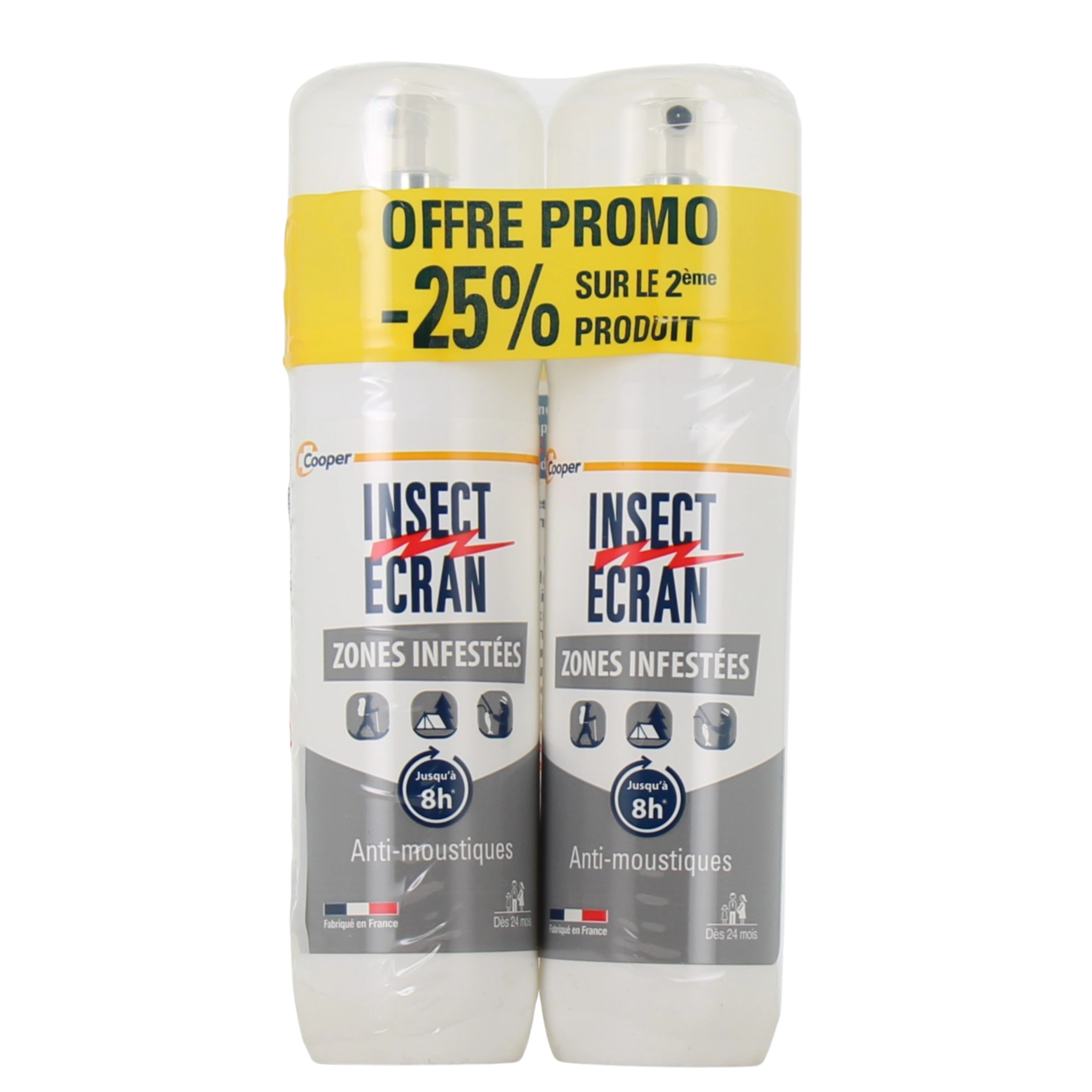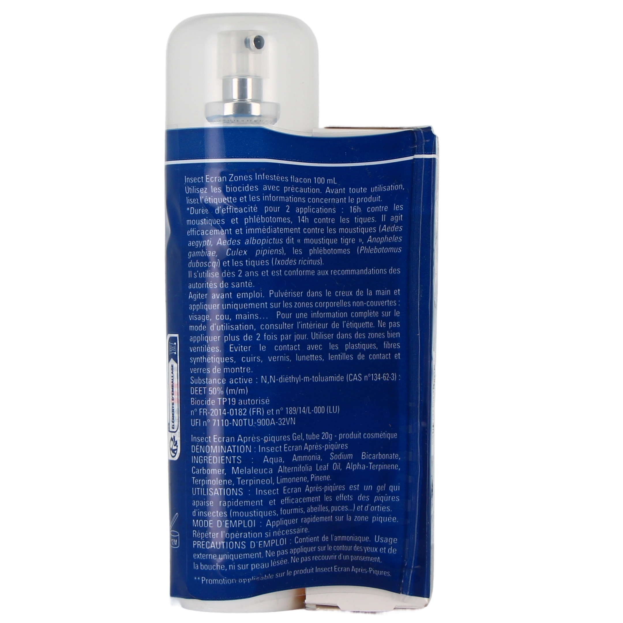 Au cœur de zones tempérées ou tropicales, il est recommandé de protéger sa peau des moustiques et insectes, souvent vecteurs de maladies et de virus (paludisme, dengue, lyme,…). Pour vous garantir une sécurité et une protection efficace dans les zones infestées notamment par le redoutable moustique tigre, Insect Ecran vous propose ce répulsif anti-moustiques spécial zones infestées. Celui-ci vous garantit, grâce à une molécule active (DEET), une efficacité jusqu'à 16 heures contre les piqûres de moustiques et de phlébotomes, à raison de 2 applications par jour, et jusqu'à 14 heures contre les morsures de tiques.