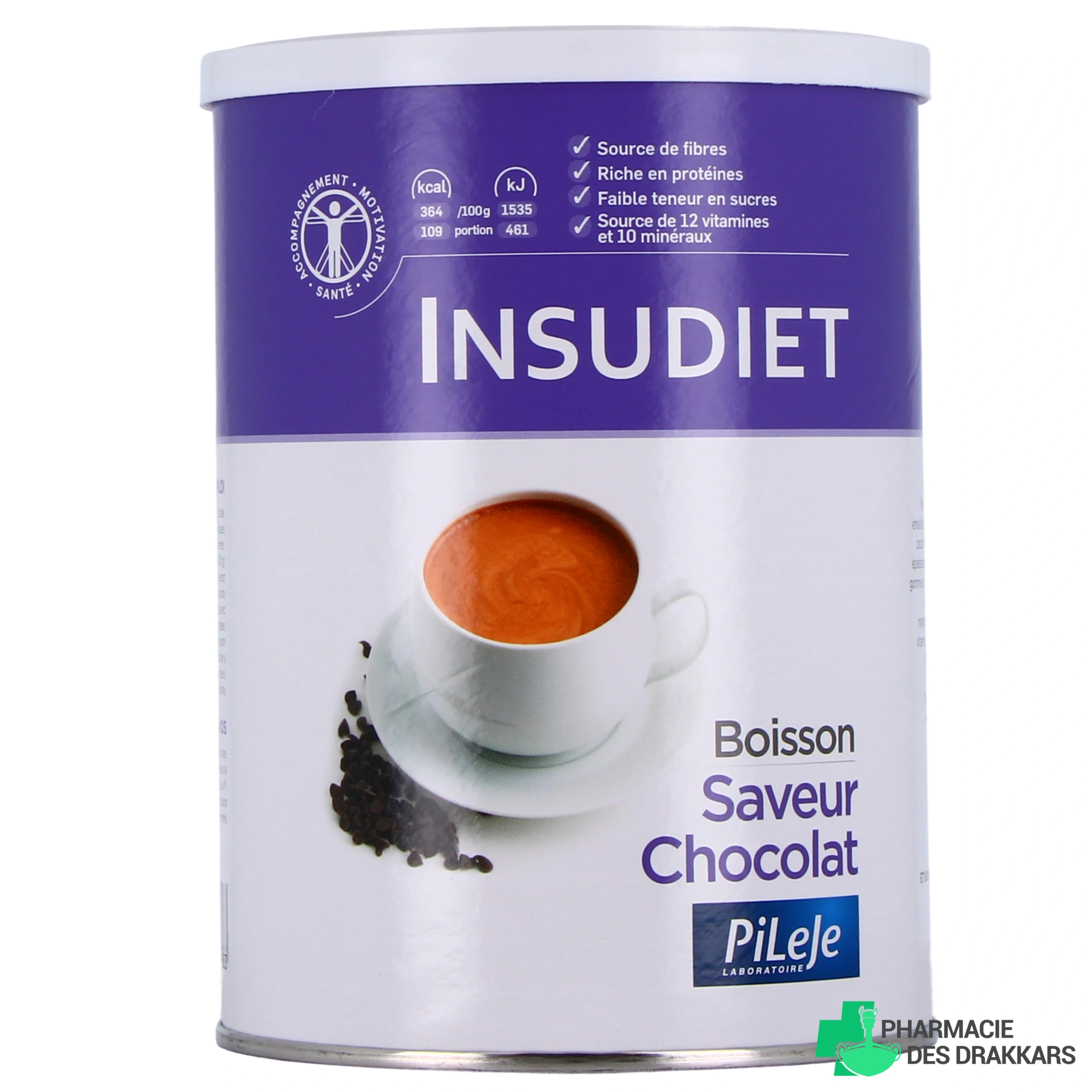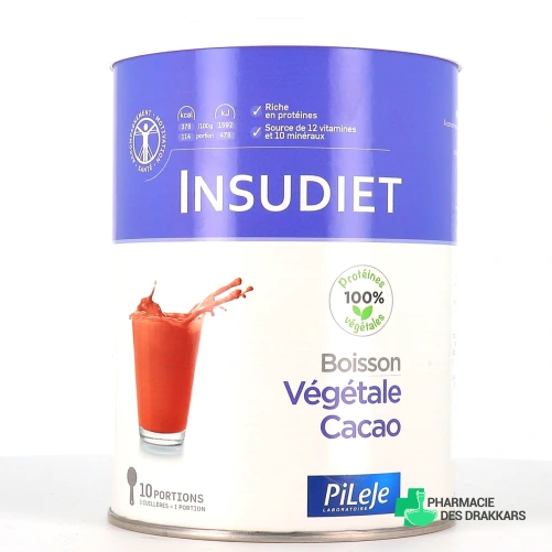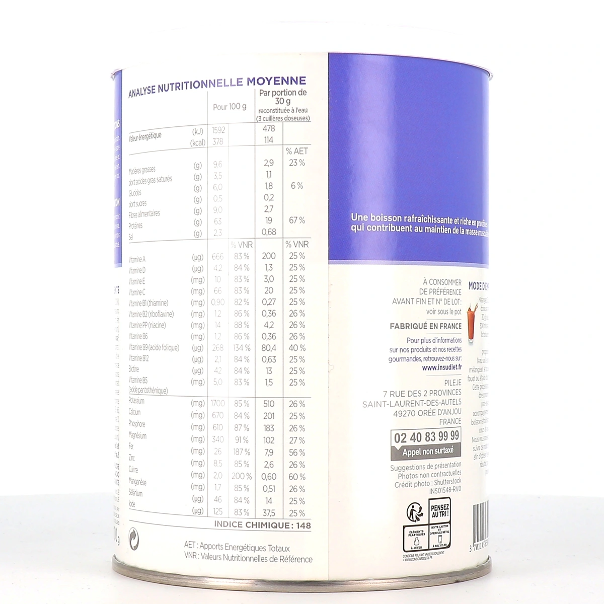 Insudiet Boisson Cacao : Protéines de lait (émulsifiant : lécithine de soja), protéines de soja (émulsifiant : lécithine de soja), poudre de cacao maigre (18,2 %), huile de soja, minéraux (potassium, phosphore, magnésium, zinc, fer, manganèse, cuivre, iode, sélénium), arômes, fructose, gomme d’acacia, protéines de blanc d'œuf, sel, vitamines (C, PP, E, B5, B6, B2, B1, A, acide folique, biotine, D, B12), édulcorant (sucralose), antioxydants (palmitate d’ascorbyle, dL-alpha-tocophérol)