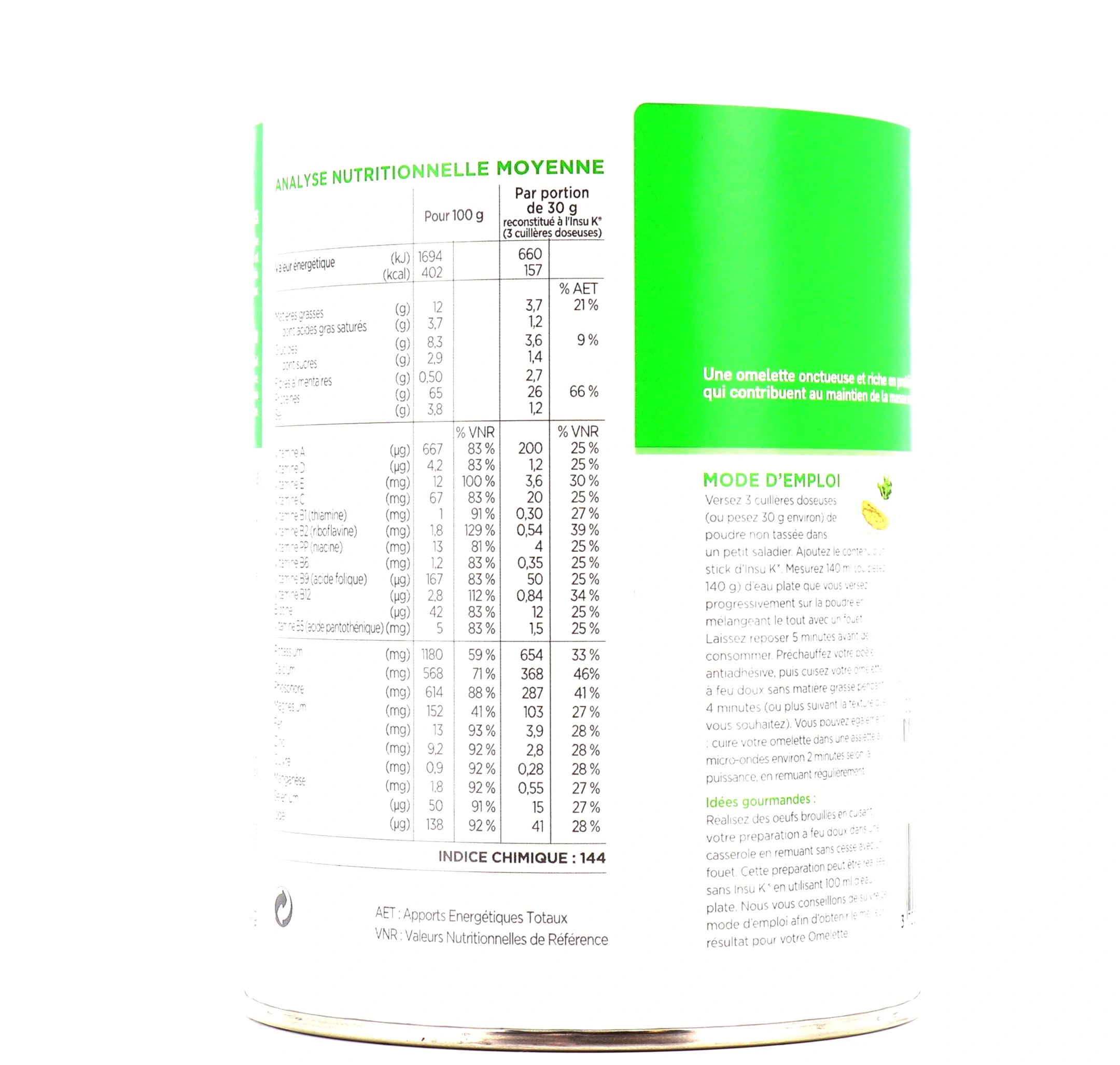 Les Laboratoires PileJe ont mis au point l'omelette fromage fines herbes Insudiet, un repas pauvre en calories qui contribue au maintien de la masse musculaire. En effet, chaque portion de 30 grammes ne contient que 156 calories une fois reconstituée avec l'Insu K. On dénombre dans la composition de cette préparation en poudre 12 vitamines essentielles au bon fonctionnement de l'organisme. Cette omelette est également source de sels minéraux indispensables à un mode de vie sain et à une alimentation équilibrée.