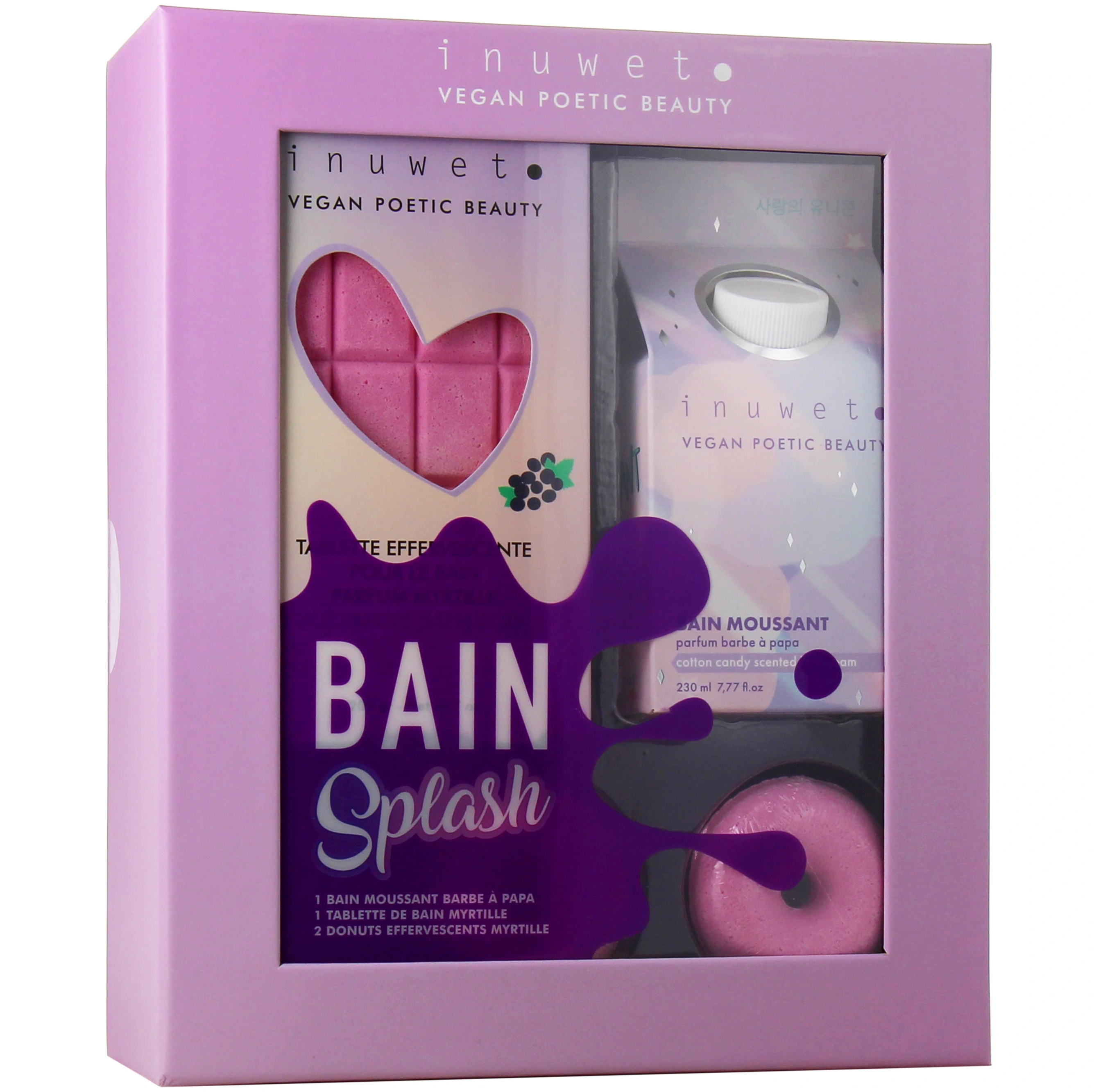 Ce coffret Bain Splash Inuwet est composé d'un bain moussant à la barbe à papa, d'une tablette de bain et de 2 donuts effervescents à la myrtille. Il prendra soin de votre pain tout en l'habillant d'un parfum intensément fruité et addictif. Le bain moussant barbe à papa offre un moment de détente et de relaxation unique grâce à sa douce odeur. 100% vegan et sans paraben, il peut également s'utiliser en gel douche !