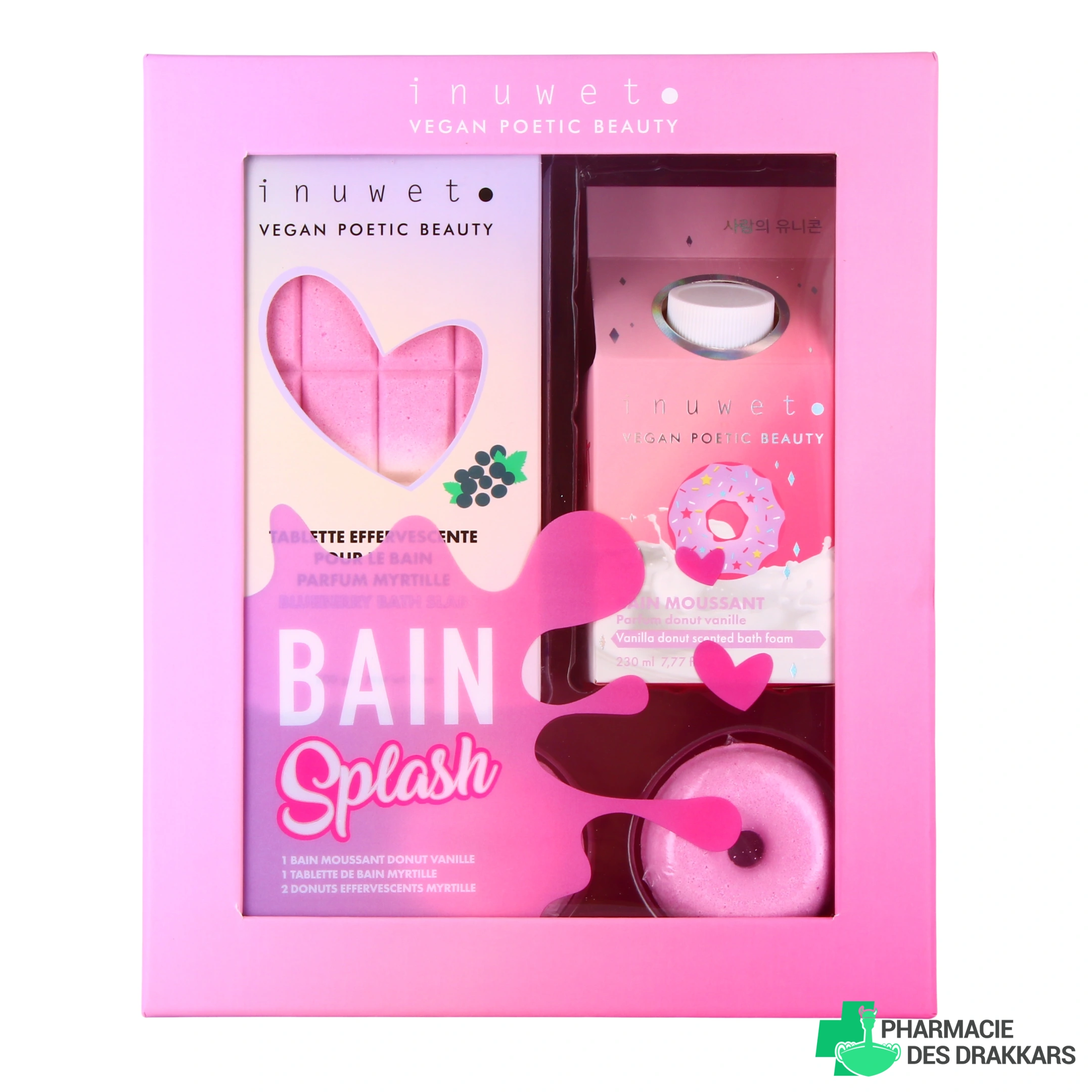 Ce coffret Bain Splash Inuwet est composé d'un bain moussant donut vanille, d'une tablette de bain et de 2 donuts effervescents à la myrtille. Il prendra soin de votre pain tout en l'habillant d'un parfum intensément fruité et addictif. Le bain moussant pafum donut vanille offre un moment de détente et de relaxation unique grâce à sa douce odeur. 100% vegan et sans paraben, il peut également s'utiliser en gel douche !