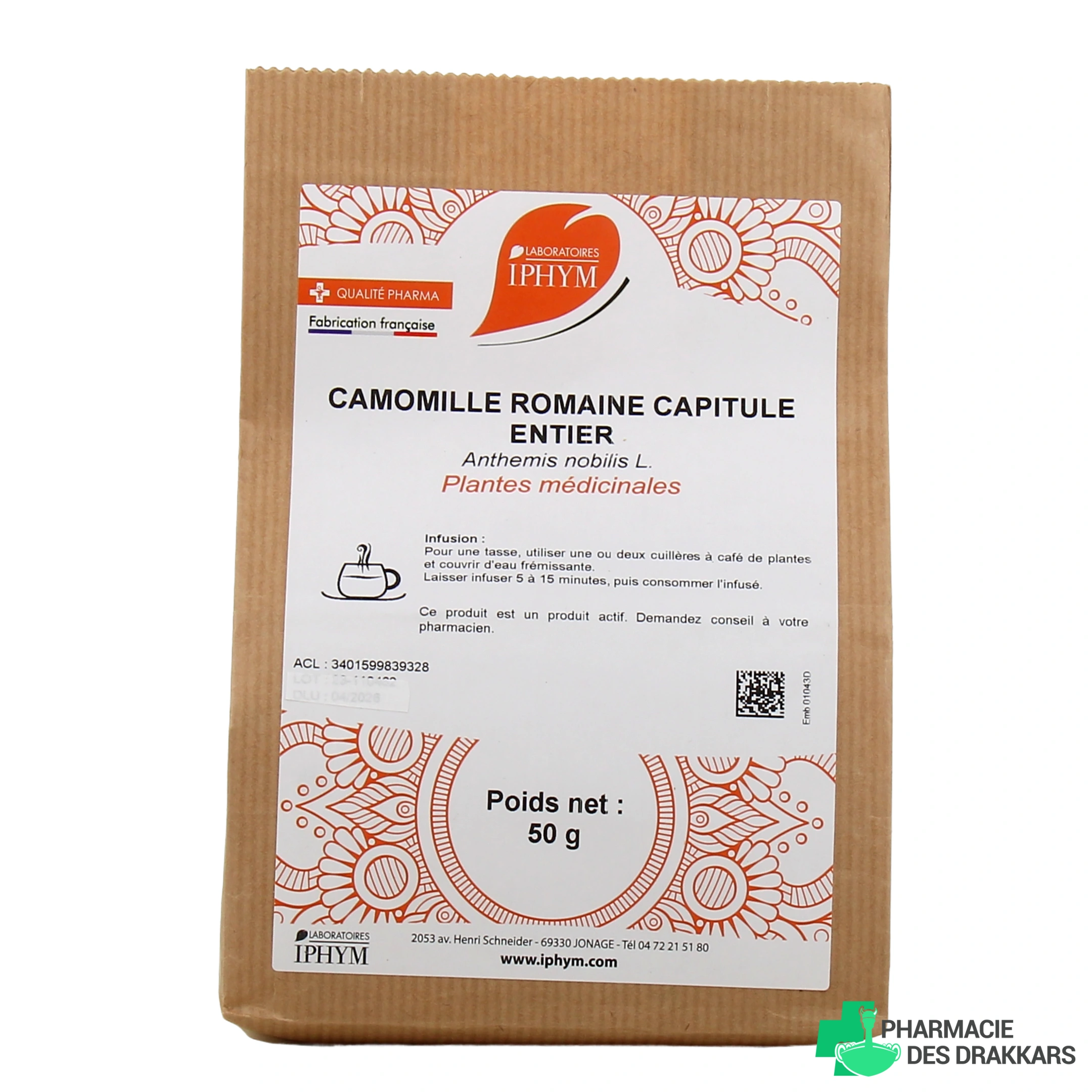 Vous pourrez sélectionner l'infusion de Camomille Romaine Capitule Entier des laboratoires Iphym dans les présentations suivantes chez Pharmacie des Drakkars : sachet de 50 g de fleurs en vrac.