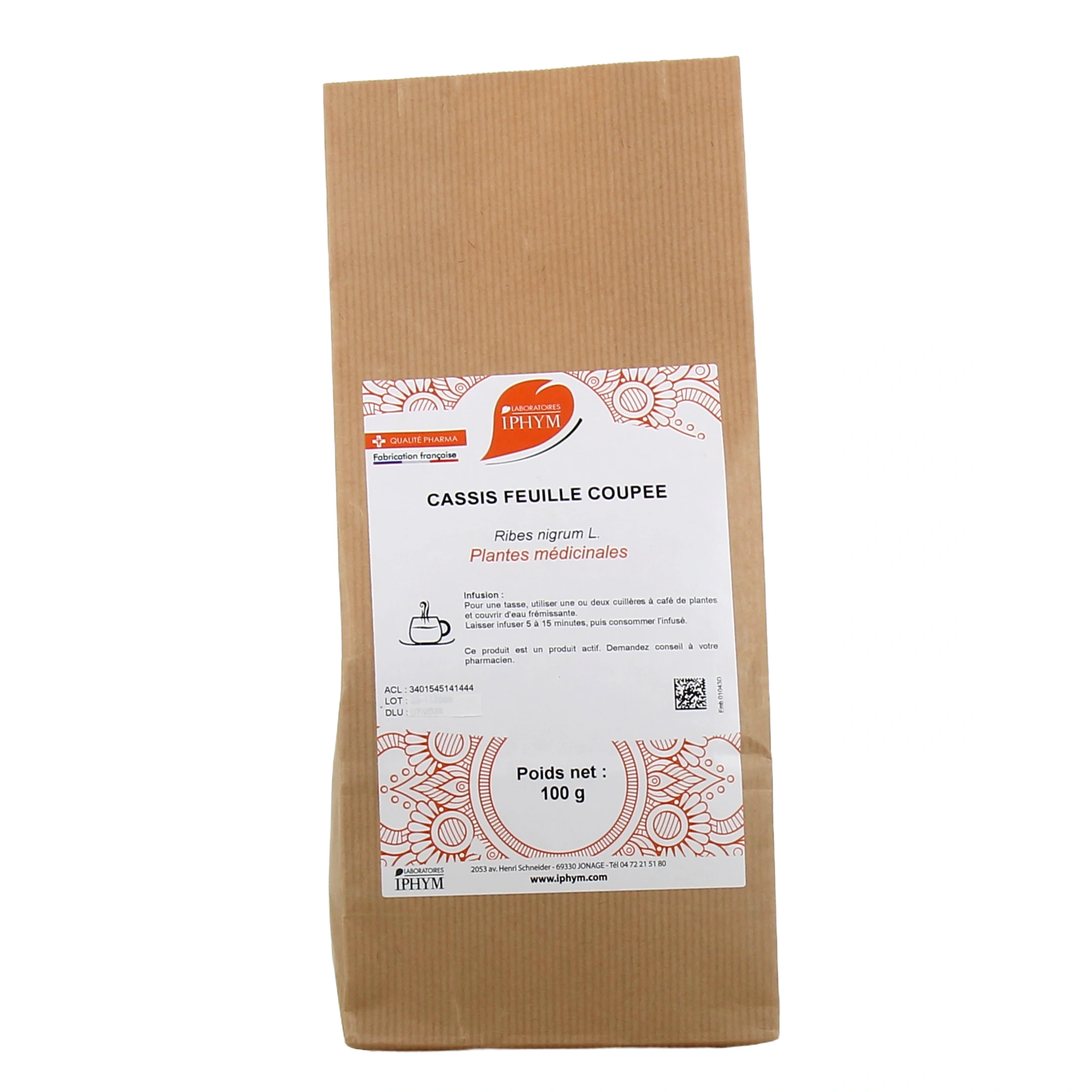 Ce sachet de Cassis Feuille Coupée des laboratoires Iphym est une infusion élaborée à partir de feuilles de cassis coupées (Ribes nigrum L.), et fabriquée en France.