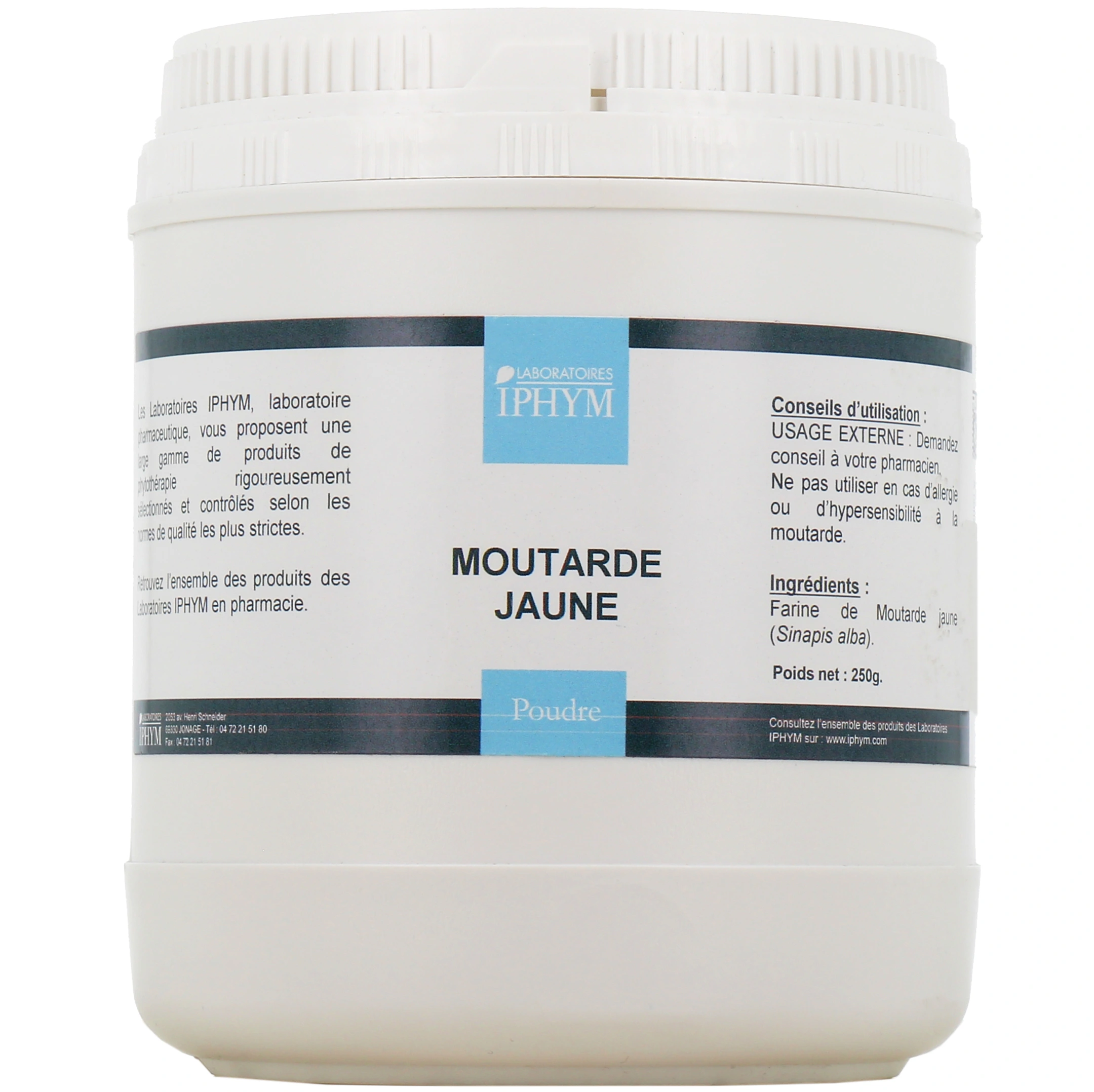 Présentation proposée pour la farine de moutarde jaune Iphym sur la pharmacie en ligne des Drakkars : Pot de 250 g de poudre