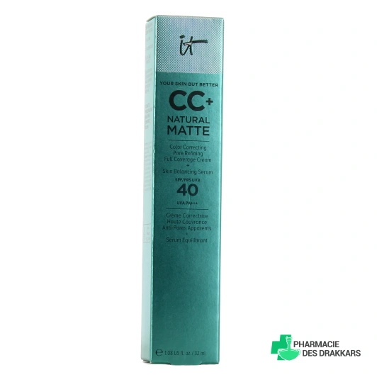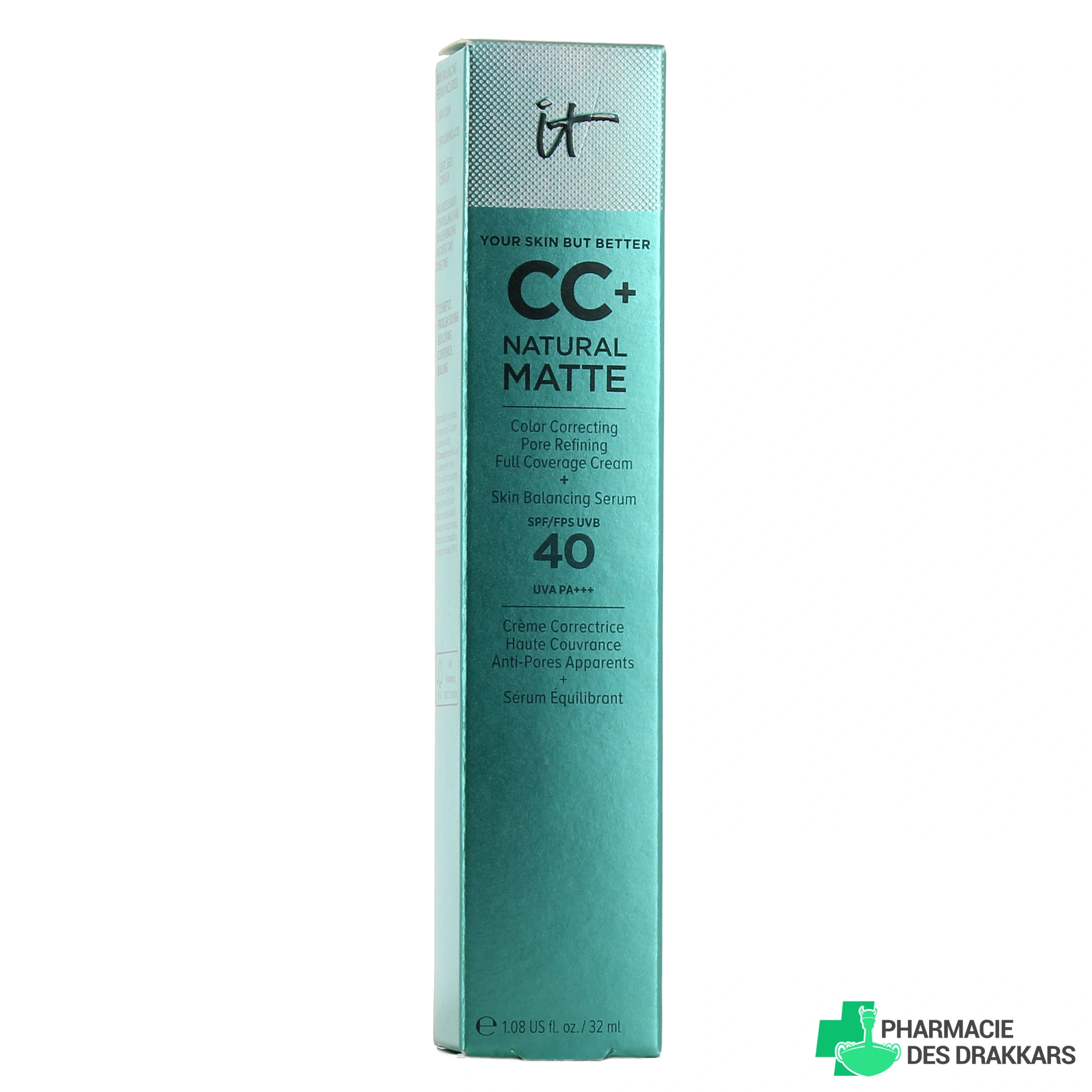 CC+ Natural Matte est une CC crème proposée par la marque It Cosmetics. Il s'agit d'une crème teintée correctrice haute couvrance idéale pour les peaux mixtes à grasses grâce à son fini mat naturel et son effet anti-pores.