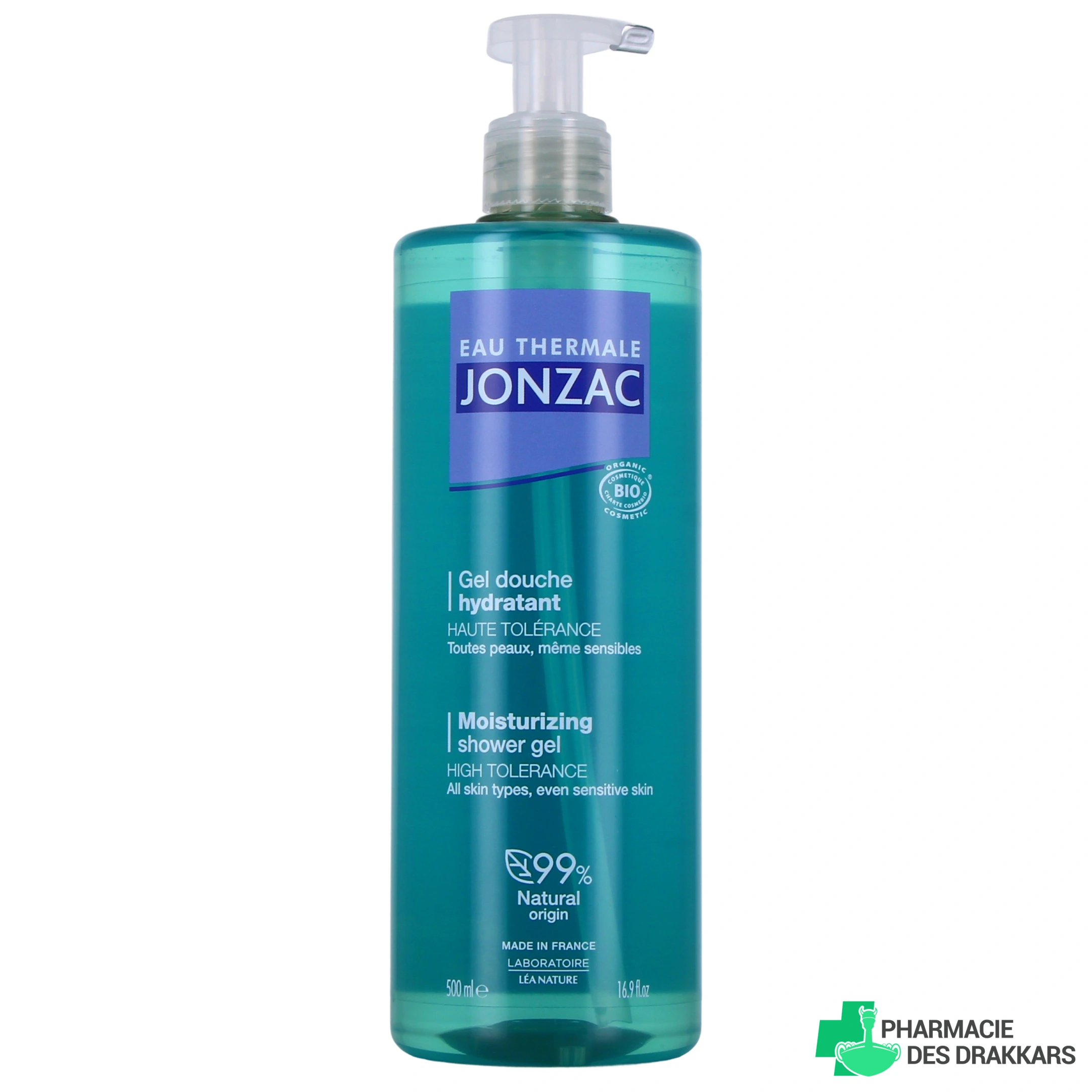 Conditionnement proposé par votre pharmacie en ligne : Flacon-pompe de 500ml de gel douche hydratant haute tolérance Jonzac.