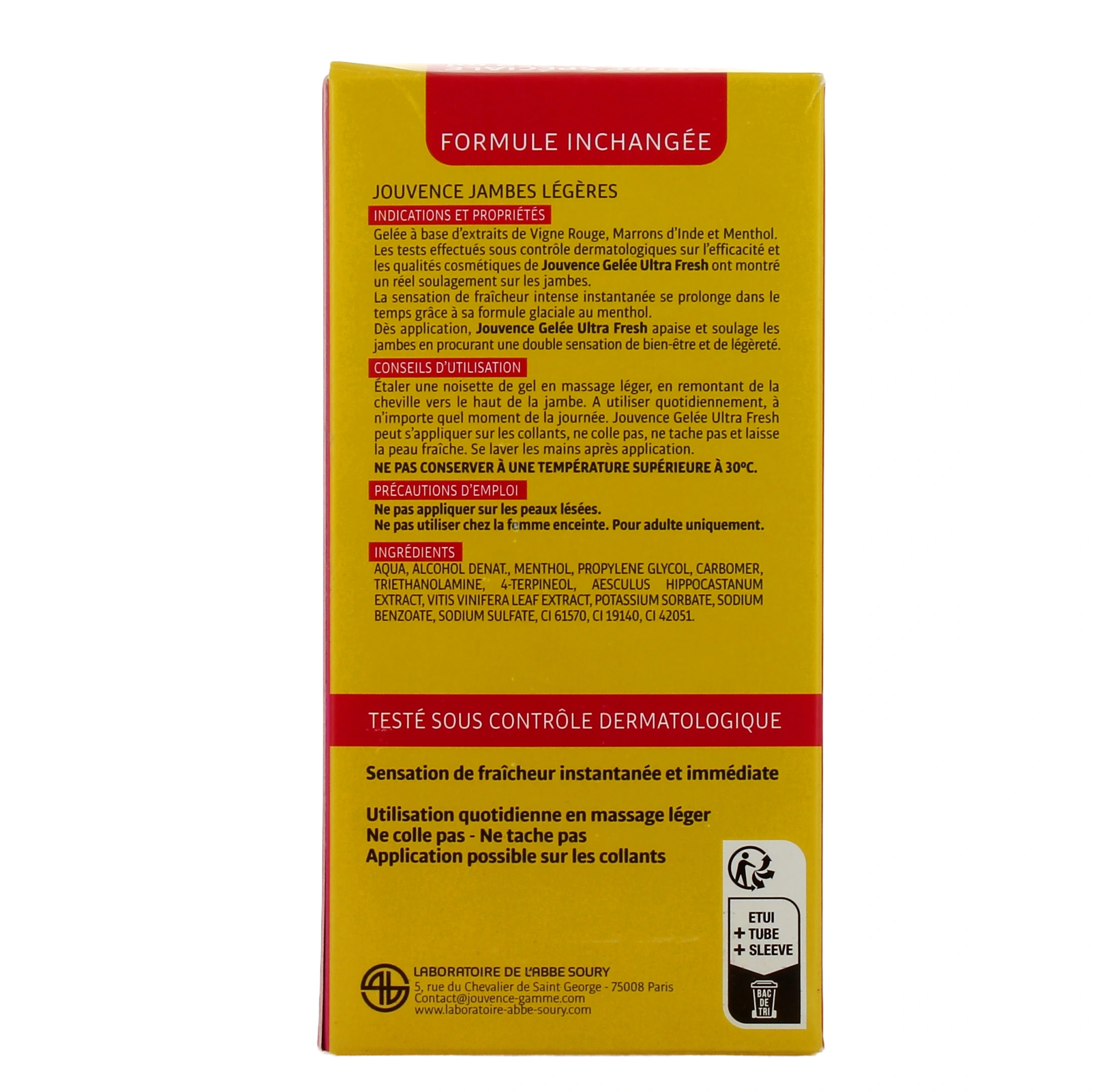 Cette gelée dermo-cosmétique testée cliniquement apporte une sensation de fraîcheur intense immédiate et durable aux jambes et aux pieds fatigués. La gelée ultra-fresh jambes légères Jouvence de l'Abbé Soury soulage les jambes et les pieds échauffés grâce à des actifs d'origine naturelle aux propriétés anti-inflammatoires et veinotoniques : le Marron d'Inde et la Vigne Rouge aident à activer la micro-circulation sanguine tandis que le Menthol apporte une sensation de fraîcheur intense et instantanée qui se prolonge dans le temps. Dès l'application, cette gelée apaise les jambes en procurant une double sensation de bien-être et de légèreté.