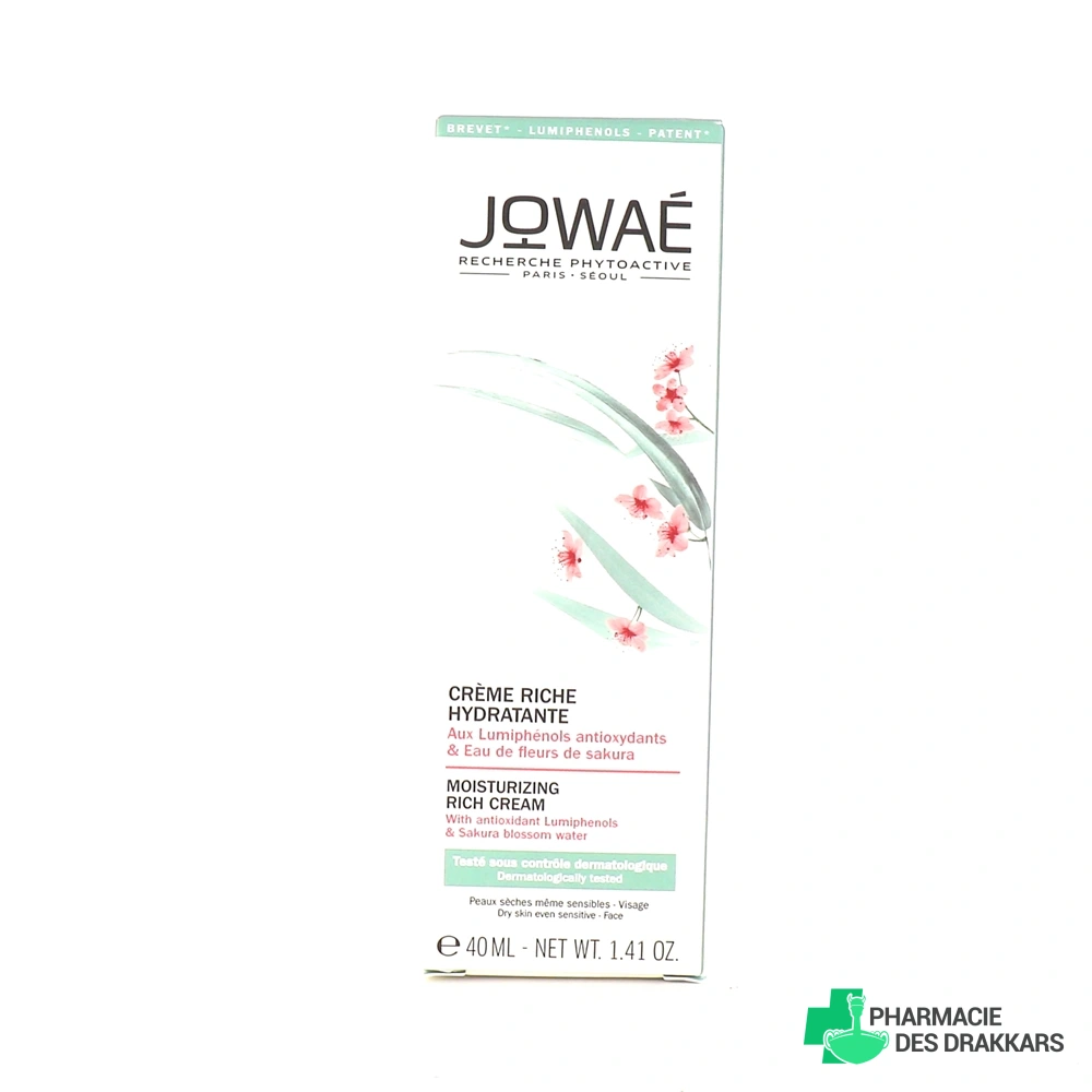 Offrez toute l'hydratation dont votre peau sèche a besoin au quotidien avec la crème riche hydratante Jowaé proposée par la Pharmacie des Drakkars ! Sa formule à base de lumiphénols antioxydants et d'eau de fleurs de Sakura en fait le soin idéal des peaux sèches et sensibles. Elle contient également du beurre de karité ainsi qu'un émollient d'origine végétale afin d'hydrater et de repulper la peau. La crème riche hydratante Jowaé est le soin incontournable pour lutter contre la déshydratation cutanée ainsi que contre les multiples inconforts que peuvent ressentir les peaux sèches et sensibles.
