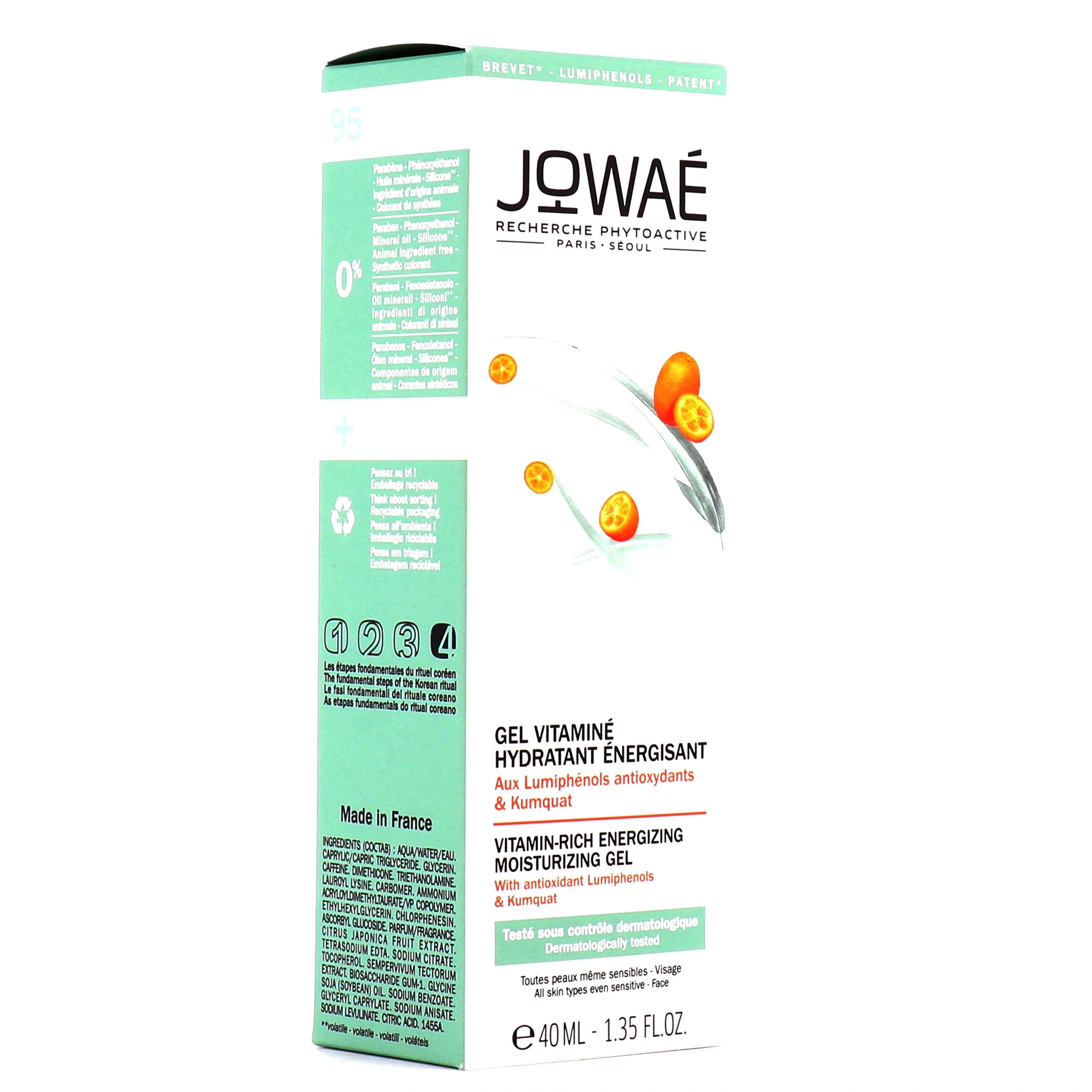 Le gel vitaminé hydratant Jowaé est un soin est composé de différents ingrédients booster de teint et d'hydratation. Les Lumiphénols, actifs brevetés intégrés à tous les soins de la marque Joawé, sont issus d'une plante médicinale aux vertus antioxydantes, détoxifiantes, réparatrices et illuminatrices pour la peau. Le Kumquat, ce petit agrume orange acidulé, est utilisé ici pour ses vertus hydratantes tandis que la Caféine est intégrée à la formule de ce soin pour ses propriétés boostantes pour la peau. La peau est hydratée, moins fatiguée, et le teint est frais et éclatant, avec ce soin hydratant et énergisant composé à près de 95% d'ingrédients d'origine naturelle.