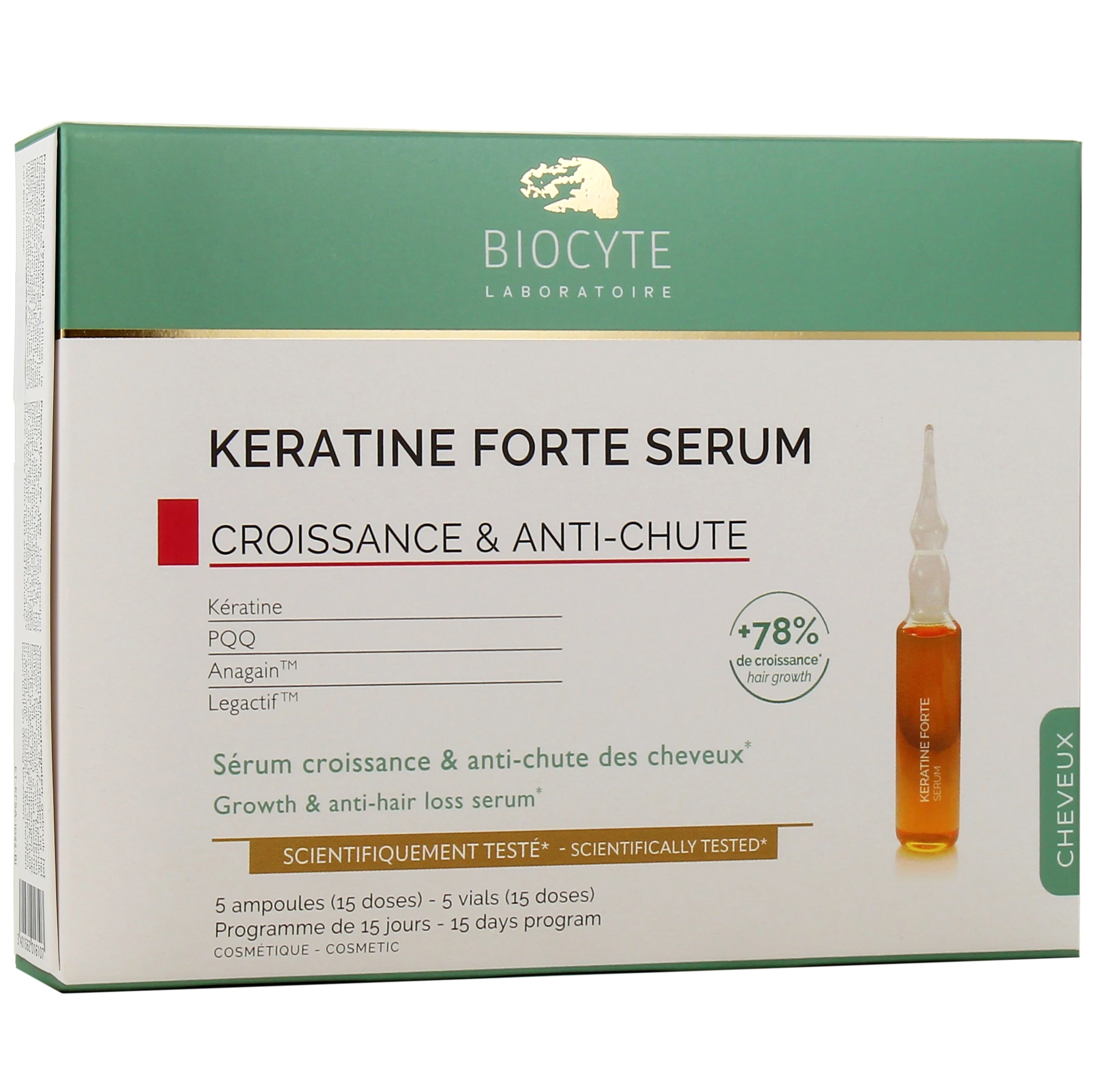 Le sérum anti-chute Kératine Forte Biocyte agit sur les principales phases responsables de la chute des cheveux grâce à ses 4 actifs à l'efficacité démontrée. On retrouve donc dans sa formulation du PQQ, un actif soigneusement sélectionné pour stimuler le développement des cellules au coeur de la fibre capillaire ; l'AnagainTM, un actif agissant sur la pousse du cheveu tout en luttant contre la chute afin de le rendre plus résistant ; le LegactifTM qui active la circulation sanguine et revitalise ainsi le cuir chevelu ainsi que la kératine, composant essentiel du cheveu à 95% aux propriétés nourrissantes.