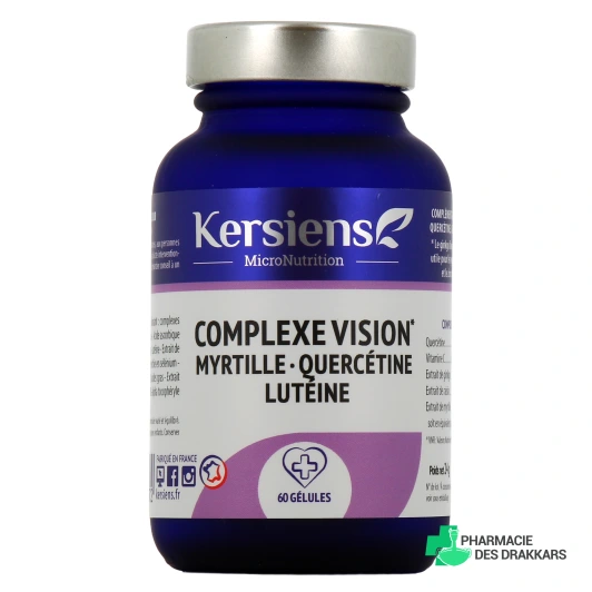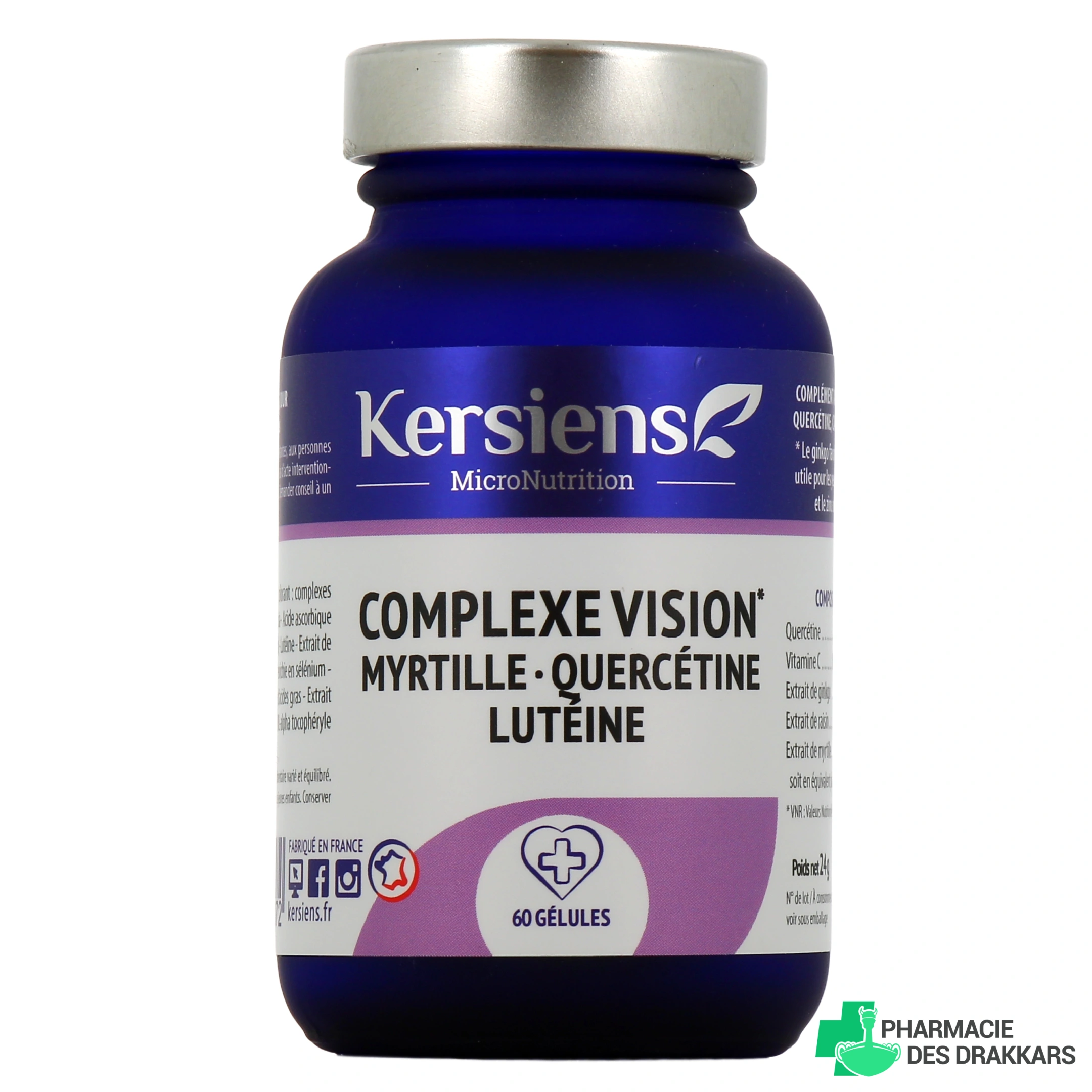 Le Complexe Vision proposé par la marque Kersiens repose sur une synergie unique de quercetine, lutéine, zéaxanthine, extraits de plantes (ginkgo, raisin, myrtille), vitamines et minéraux. Le ginkgo favorise la circulation périphérique, particulièrement utile pour les yeux, et contribue à une bonne vision. Les vitamines A, B2 et le zinc contribuent au maintien d'une vision normale.