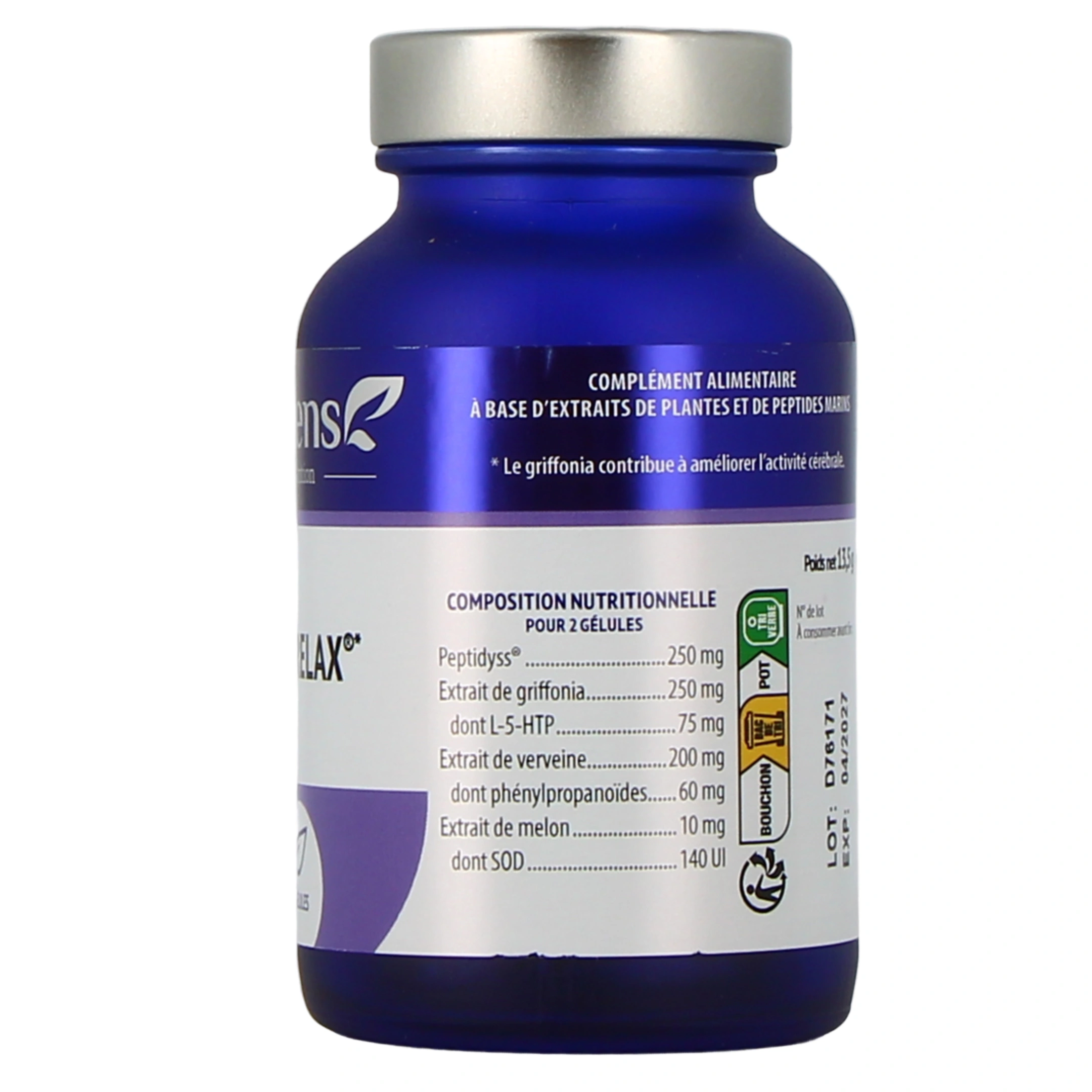 Hydrolysat de poisson Peptidyss (peptides marins), Extrait de graine de griffonia (Griffonia simplicifolia) titré en L-5-HTP, Extrait de feuille de verveine odorante (Aloysia citriodora) PLX® BS 30 titré en phénylpropanoïdes, Enveloppe de la gélule : gélatine marine (poisson), colorant : complexe cuivrique de chlorophyllines, Extrait de pulpe de melon (Cucumis melo).