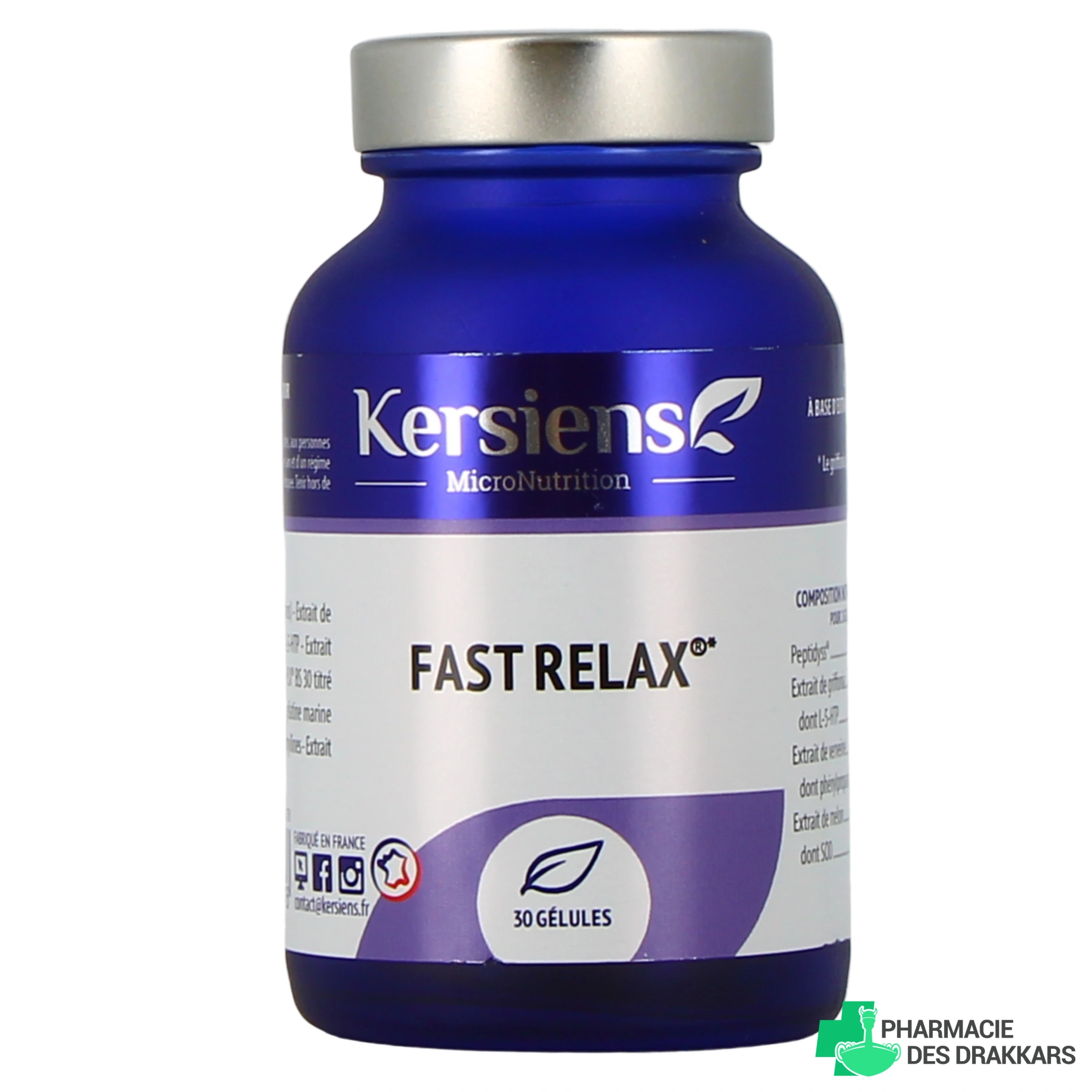 Le complément alimentaire Kersiens Fast Relax est à retrouver dans les présentations suivantes chez Pharmacie des Drakkars : flacon de 30 gélules (pour 15 jours).