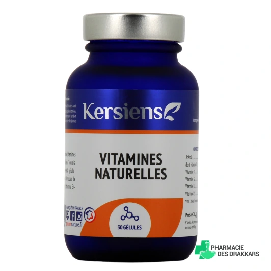 Kersiens Vitamines Naturelles est un complément alimentaire sous forme de gélules. Comme son nom l'indique, il est formulé avec des vitamines 100 % naturelles et non de synthèse.