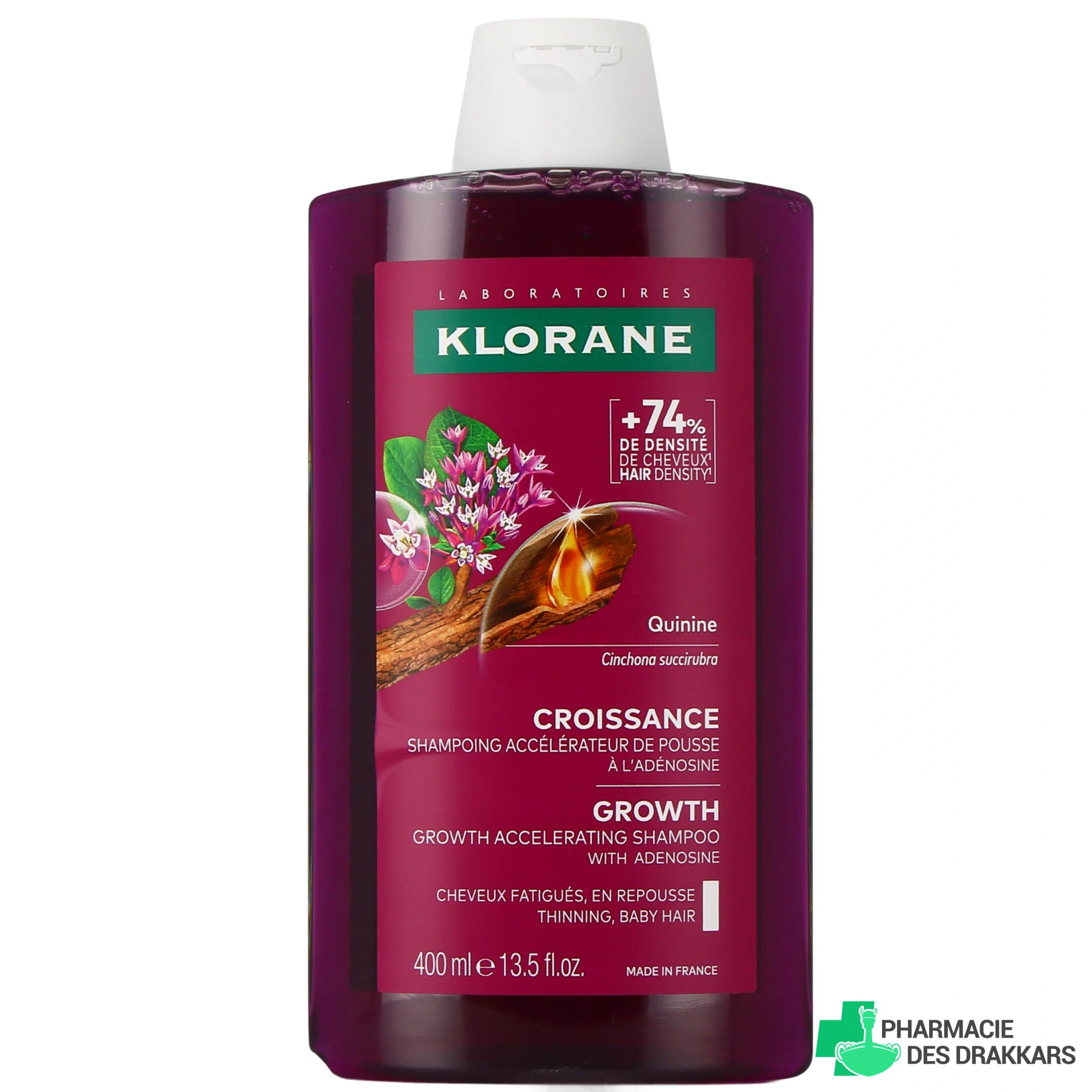 Au cœur de la formule de ce shampoing pousse cheveux, la quinine, extraite de l'écorce de quinquina, est traditionnellement reconnue pour ses propriétés fortifiantes et revitalisantes. Elle stimule le cuir chevelu et aide à renforcer les cheveux dès la racine. L'adénosine agit en synergie pour favoriser la croissance capillaire. Finalement, le complexe kératine-like répare la fibre capillaire en profondeur et contribue à redensifier et fortifier les cheveux.