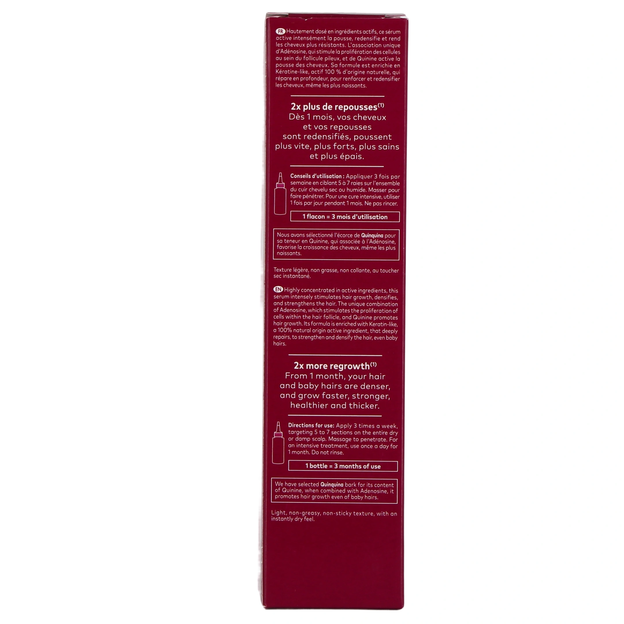 En effet, le sérum prolonge l'action du shampoing grâce à sa formule concentrée en quinine et adénosine appliquée directement sur le cuir chevelu sans rinçage. Ensemble, ils renforcent la fibre capillaire, stimulent la croissance et contribuent à améliorer la densité des cheveux.