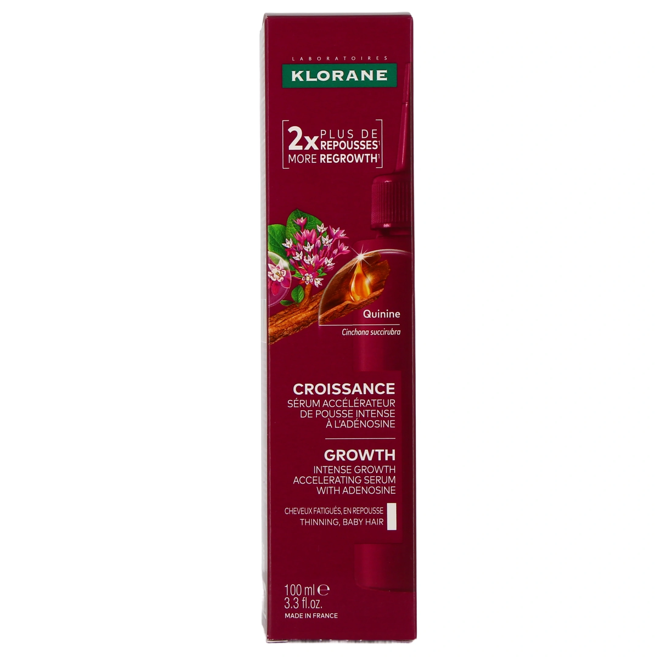 Au cœur de la formule de ce shampoing pousse cheveux, la quinine, extraite de l'écorce de quinquina, est traditionnellement reconnue pour ses propriétés fortifiantes et revitalisantes. Elle stimule le cuir chevelu et aide à renforcer les cheveux dès la racine. L'adénosine agit en synergie pour favoriser la croissance capillaire. Finalement, le complexe kératine-like répare la fibre capillaire en profondeur et contribue à redensifier et fortifier les cheveux.