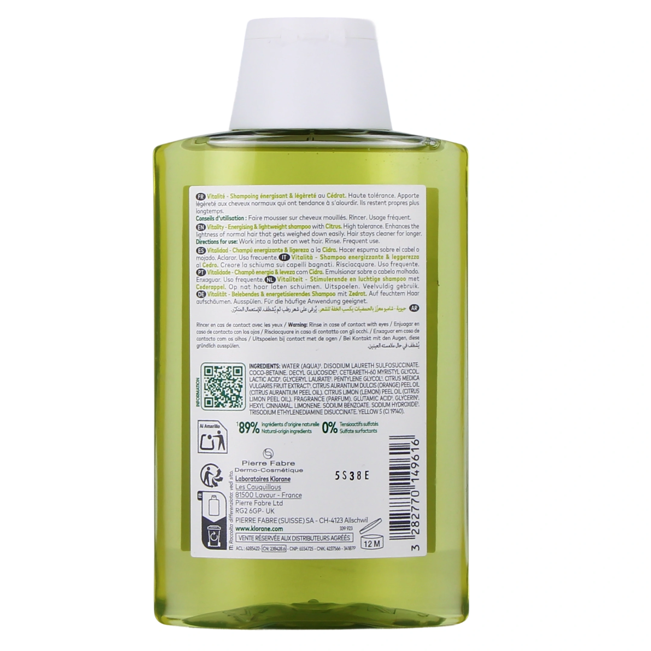 Ce shampooing au Cédrat Klorane apporte légèreté et vitalité dès la première utilisation. Il contient de l'acide glutamique et de la pulpe de cédrat pour nettoyer et purifier les cheveux ainsi que le cuir chevelu. Il régule la production de sébum et retarde le regraissage des cheveux, permettant d'espacer les shampooings plus facilement.