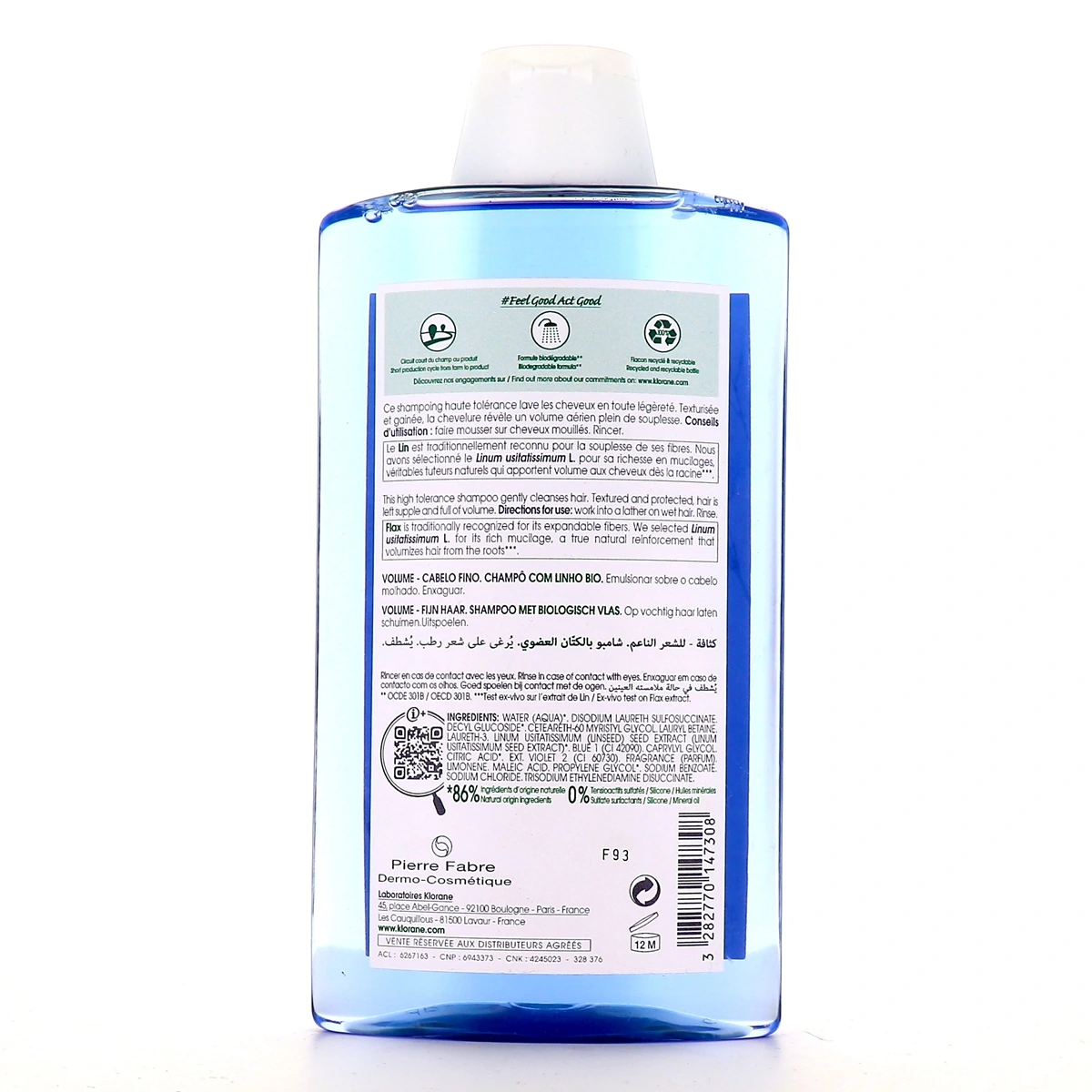 Les présentations proposées par votre pharmacie en ligne pour le shampooing aux fibres de Lin Volume de Klorane : flacon de 400 ml.
