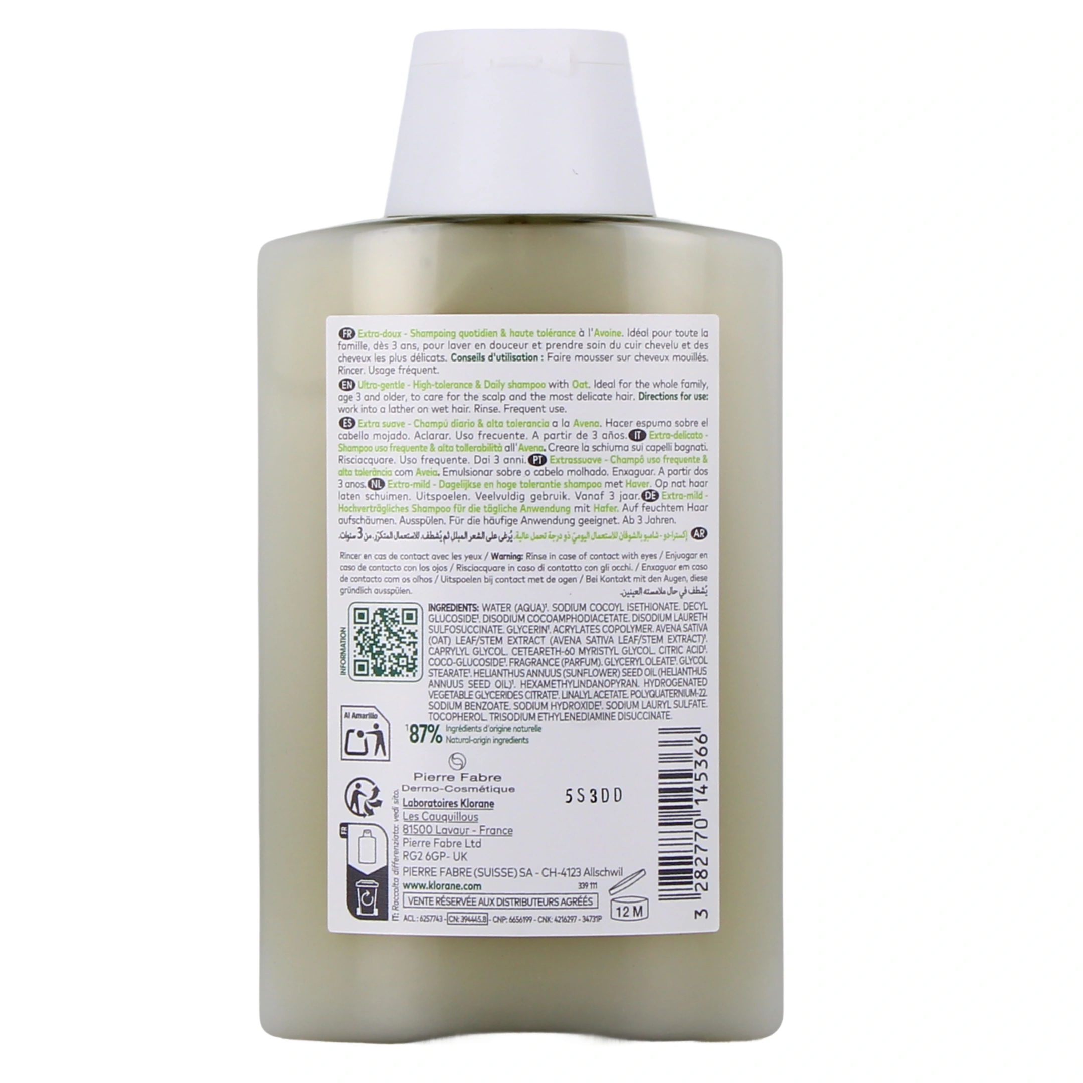 Formulé à partir d'avoine sélectionnée dans des cultures Bio du sud-ouest de la France, le shampooing extra-doux à l'avoine de Klorane est également composé d'ingrédients d'origine naturelle à 87 %.
