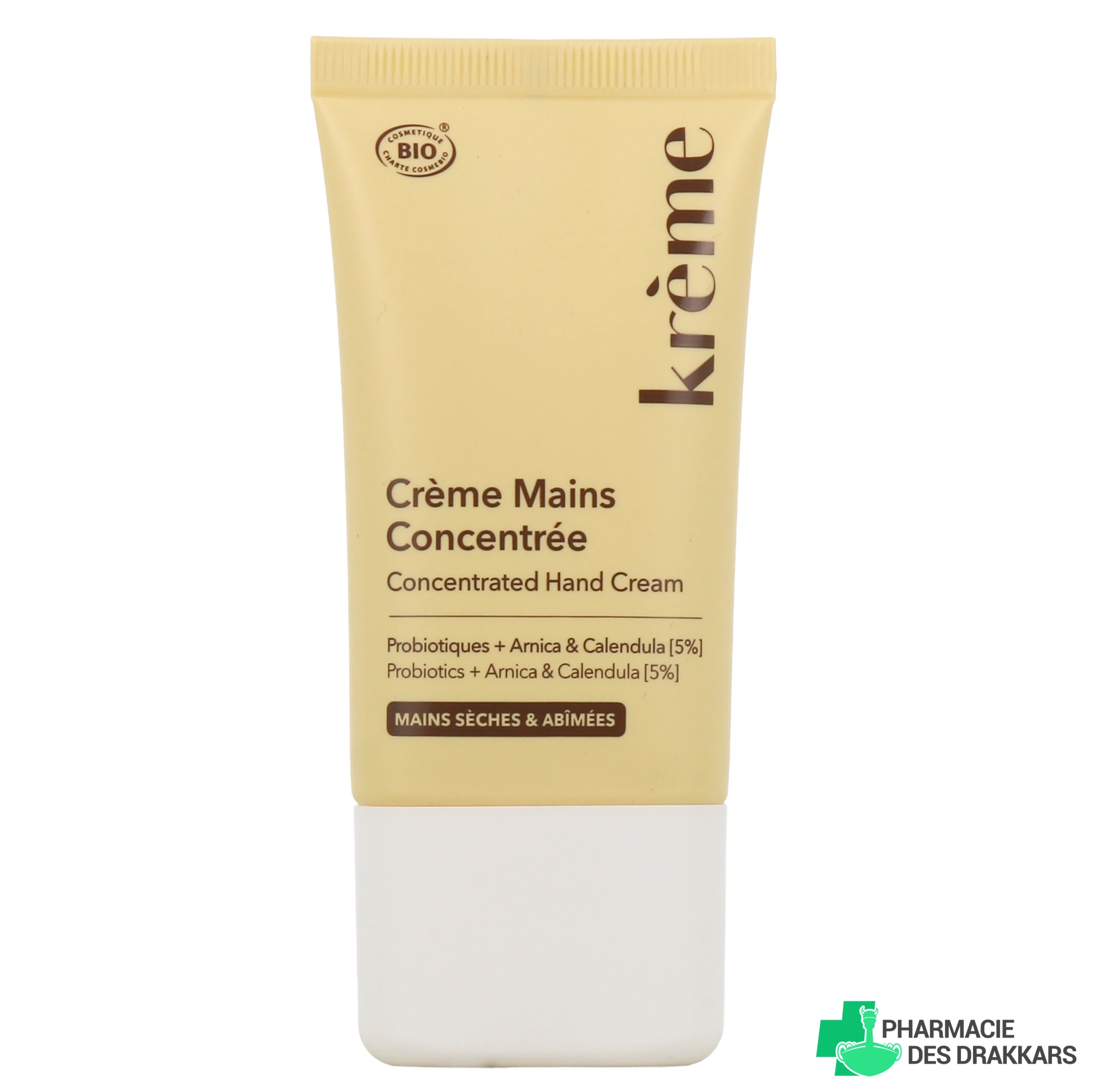 Fruit d'une association entre des plantes médicinales traditionnelles, le calendula français et l'arnica des montagnes) et des probiotiques, la crème Mains Concentrée Bio de Krème est idéale pour vous aider à retrouver une peau plus douce. Pratique, elle pénètre très rapidement la peau en 10 secondes, sans laisser de voile gras ou collant à sa surface.