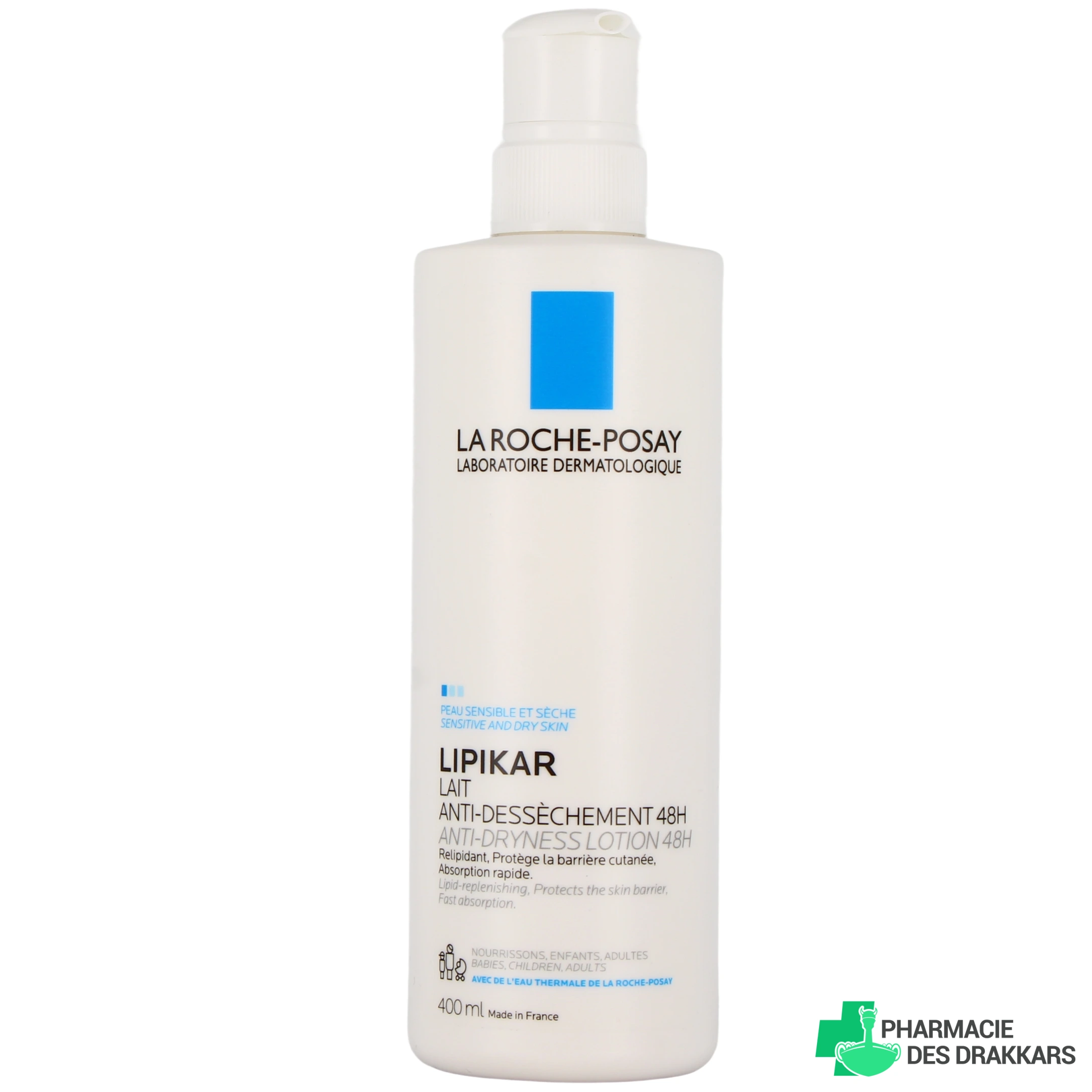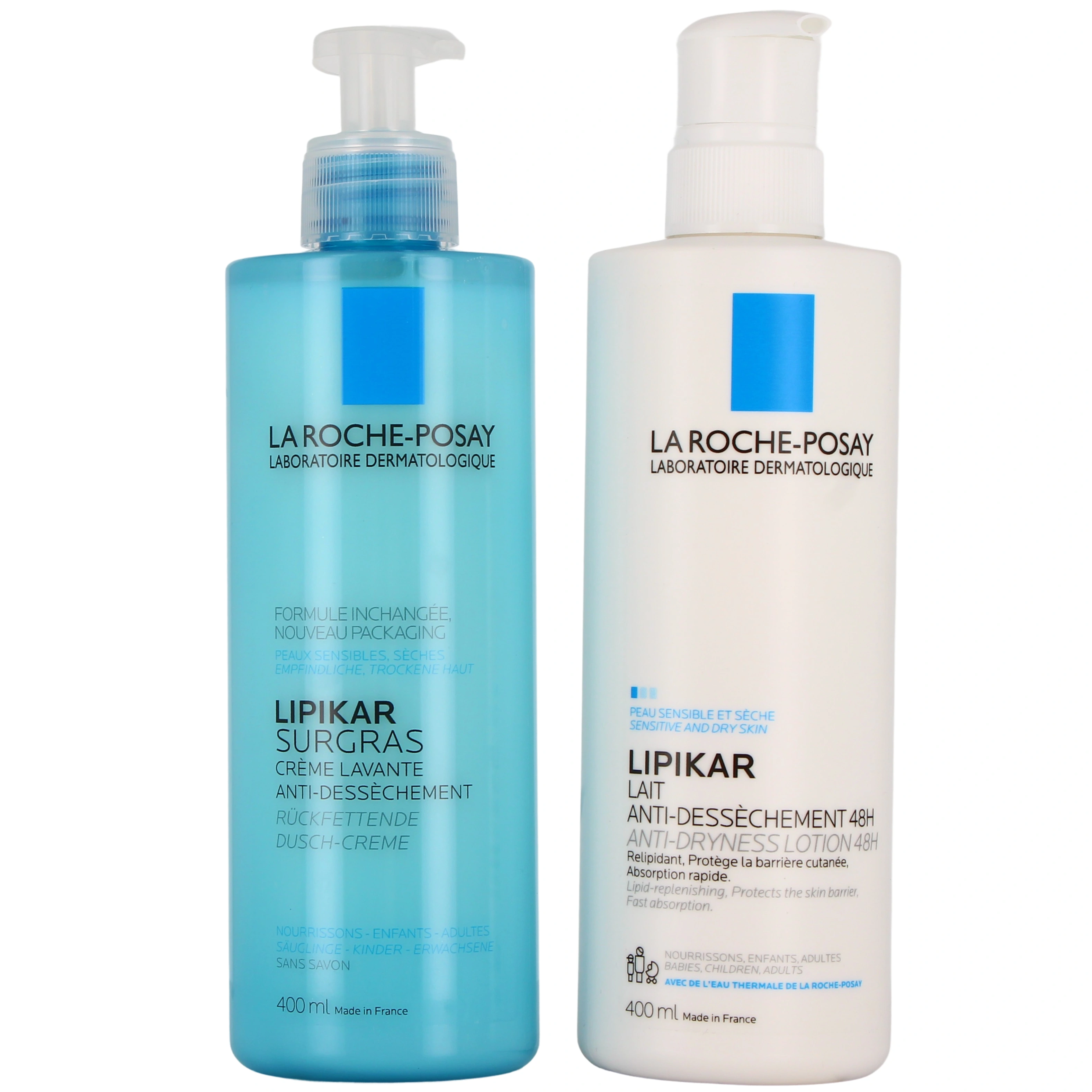 - Routine Peau Sèche Lipikar : flacon-Pompe de 400 ml en duo avec le lait anti-dessèchement 48H La Roche-Posay Lipikar en flacon-pompe de 400 ml également.