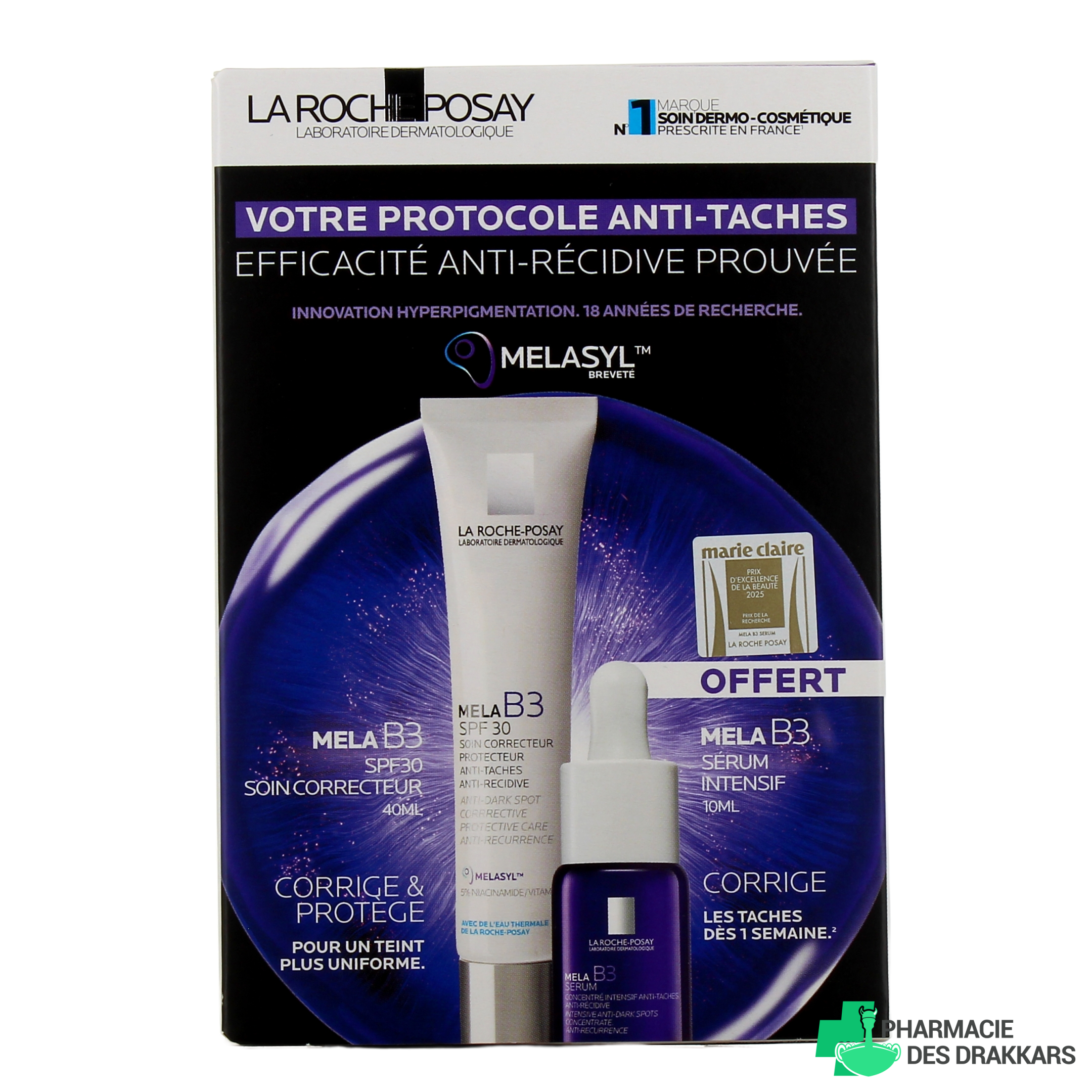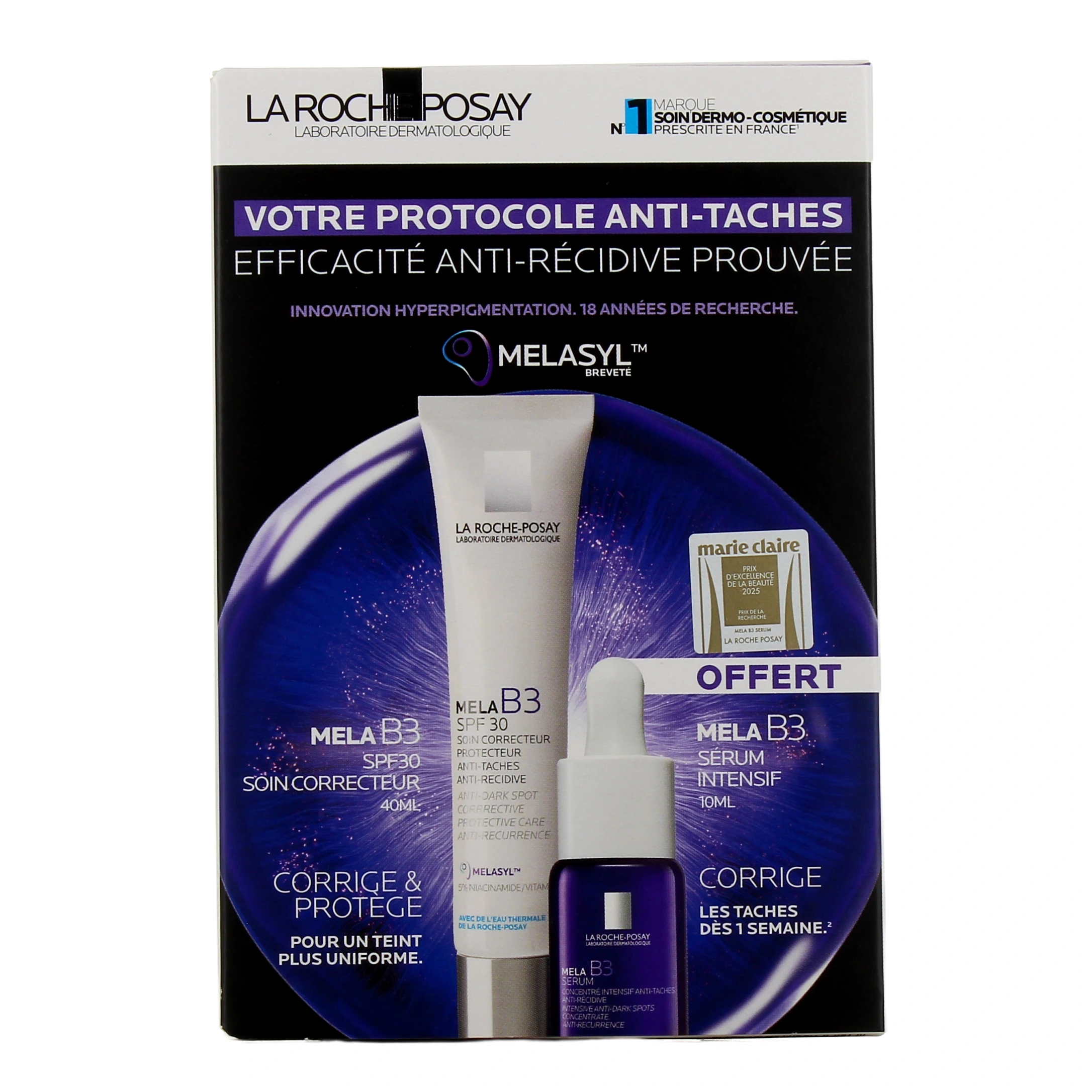 Le soin quotidien Mela B3 SPF30 La Roche-Posay repose sur un ingrédient clé : le Melasyl. Issu de longues années de recherche, cet actif breveté réduit visiblement les taches brunes, y compris les taches persistantes, avec des résultats sur le long terme. Il cible les défauts de pigmentation tout en préservant la carnation naturelle. La formule renferme également 5 % de niacinamide, apprécié pour ses vertus anti-taches, anti-inflammatoires et régénérantes. Enfin, l'eau thermale de La Roche-Posay est connue pour son action apaisante et sa teneur en sélénium, un antioxydant naturel.