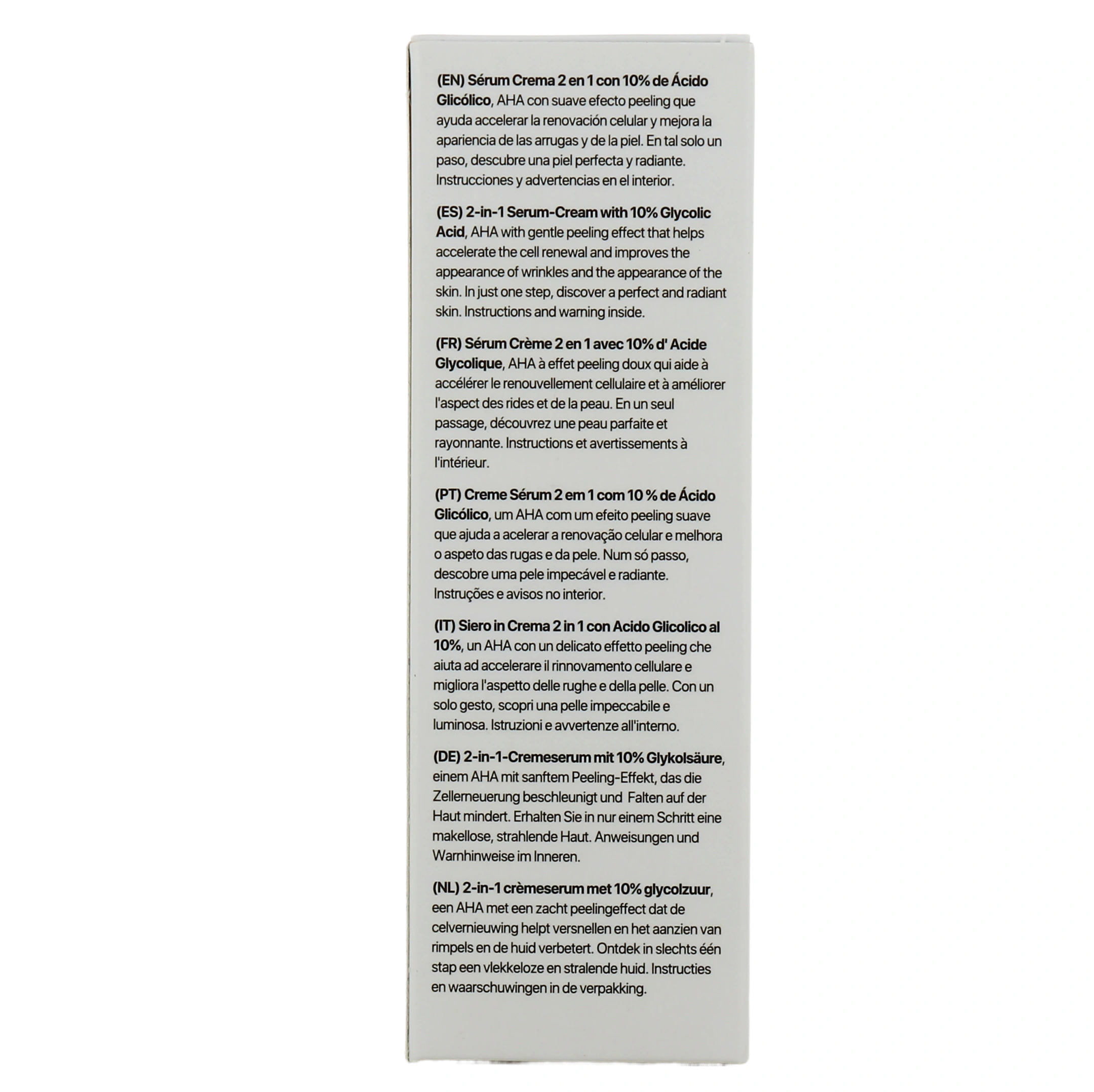 Adapté à tous les types de peau, ce sérum crème à l'acide glycolique LaCabine bénéficie d'une technologie 2 en 1 : sa formule particulièrement légère associe l'efficacité d'un sérum à la douceur et au confort apporté par la crème hydratante. L'acide glycolique est un AHA (Alpha Hydroxy Acids ou acides α-hydroxylés) dont la petite taille permet une absorption et une pénétration optimales, lui permettant d'atteindre les couches les plus profondes de votre peau, pour des résultats plus intenses et visibles. Il permet d'exfolier la couche superficielle de l'épiderme, accélérant ainsi le processus de renouvellement des cellules, tout en réactivant la formation naturelle de collagène et d'elastine.