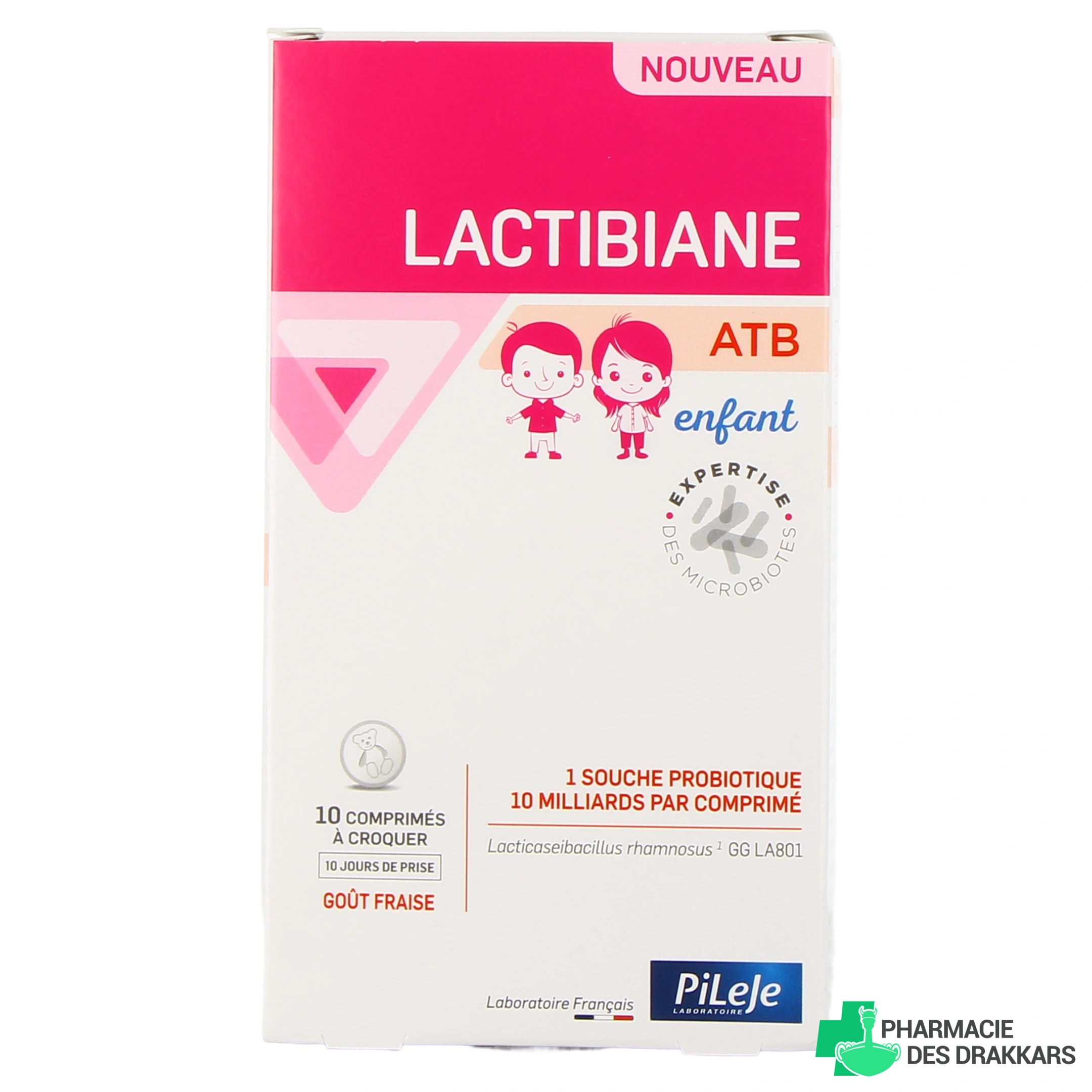Mis au point par le laboratoire français PiLeJe et fabriqué en France, le complément alimentaire Lactibiane ATB Enfant se présente sous la forme de comprimés à croquer au bon goût de fraise. 1 dose journalière (soit 1 comprimé à croquer) apporte à votre enfant 10 milliards de ferments lactiques, ainsi que 55 mg d'extrait d'acérola (dont 12 mg de vitamine C).