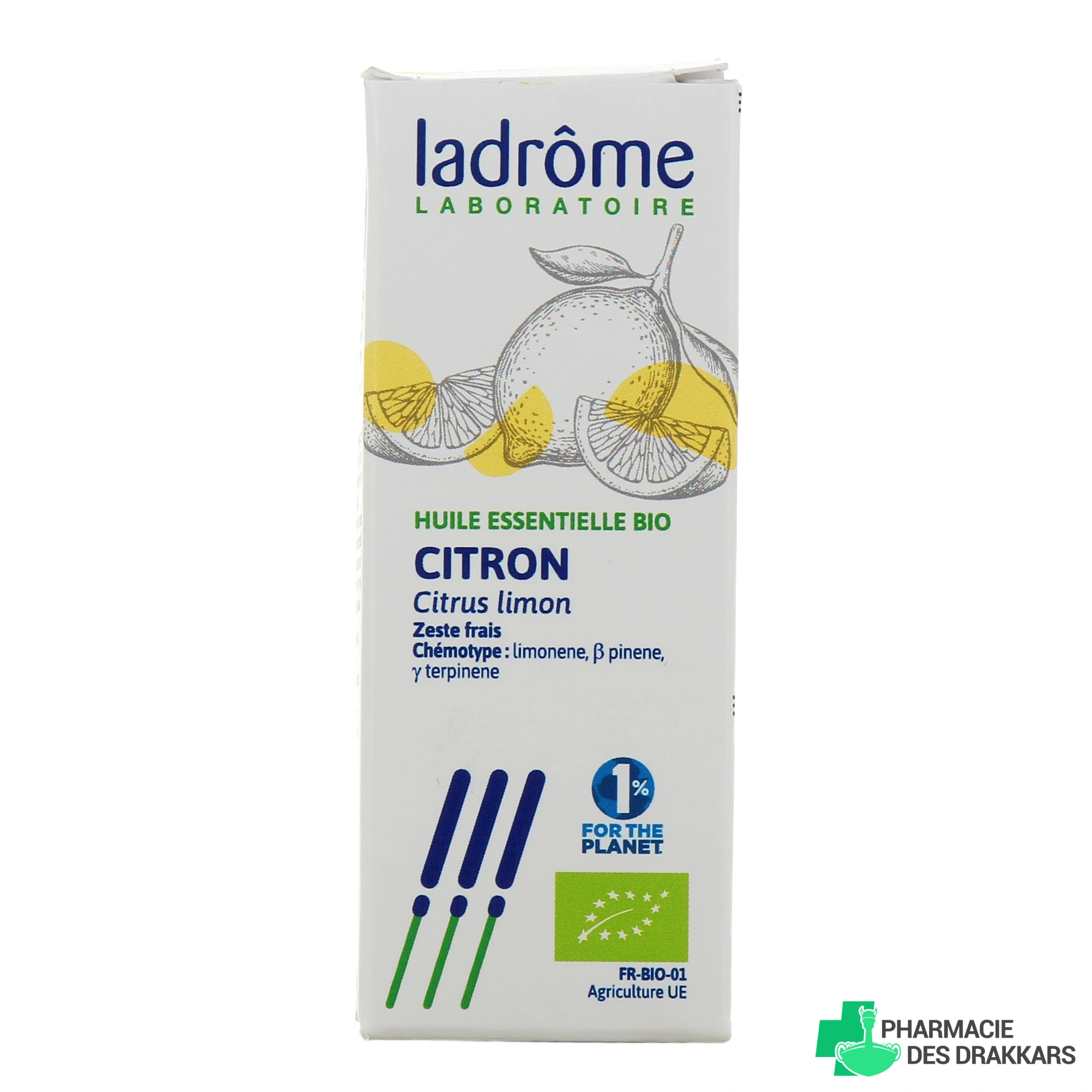 L'huile essentielle de citron bio proposée par la marque Ladrôme est extraite des zestes de citron. Le citronnier est un arbuste cultivé sur l'ensemble du pourtour méditerranéen. Son huile essentielle se caractérise par une couleur jaune vif pouvant brunir avec le temps, et un parfum fruité, acide et frais. Il s'agit de l'une des huiles essentielles les plus utilisées en aromathérapie. L'huile essentielle de citron est également très utilisée en pâtisserie et en confiserie, dans l'industrie cosmétique et dans le domaine de la parfumerie.