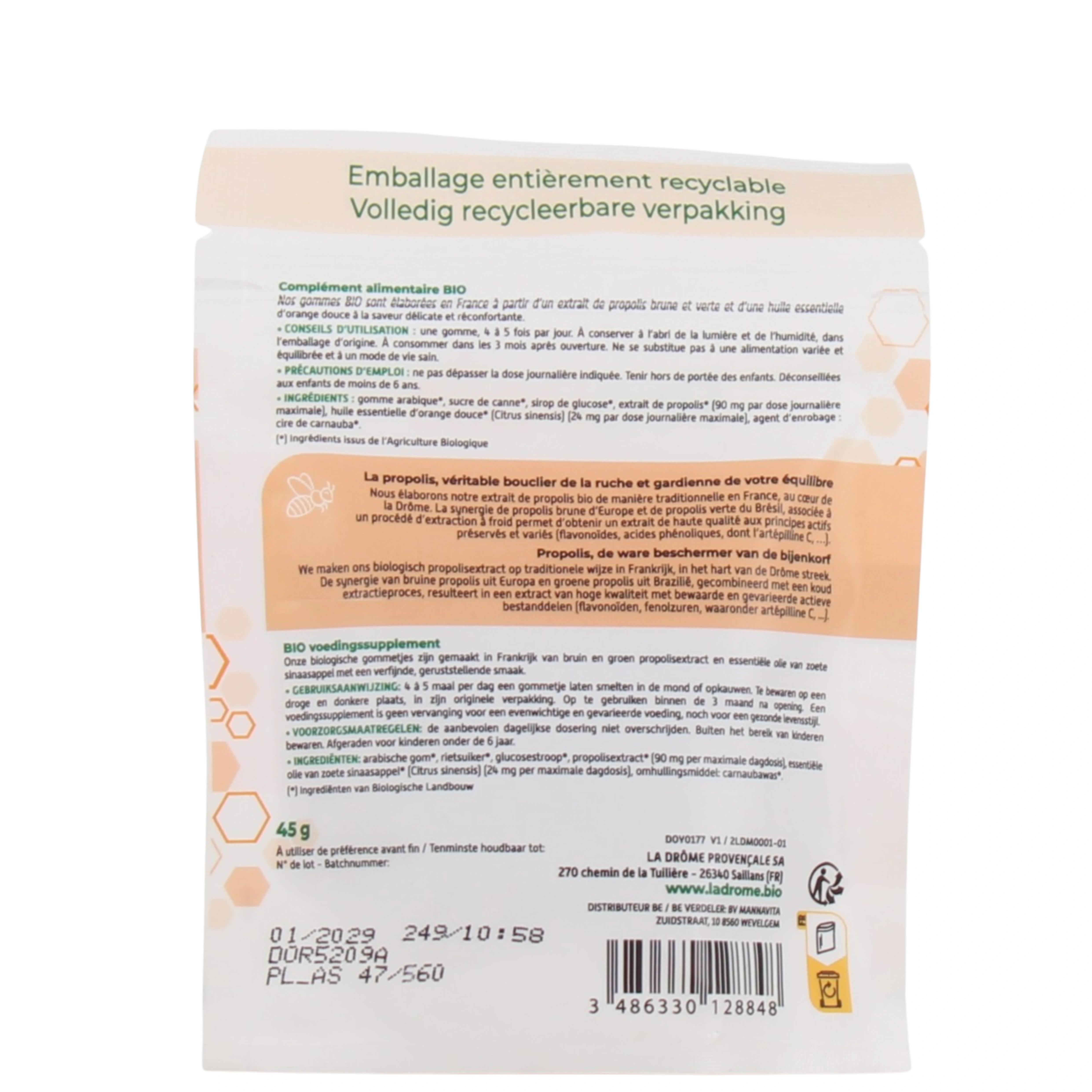 Conditionnement proposé par la Pharmacie des Drakkars pour les gommes Orange Bio Ladrôme ProPolis : sachet de 45 grammes.