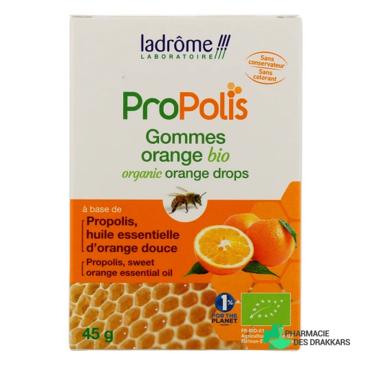 Les gommes Orange Bio Ladrôme ProPolis sont un complément alimentaire sous forme de gommes bio enrichies en propolis et huile d'orange douce. Elles aident à soulager les gorges irritées grâce aux propriétés de la propolis. Elles peuvent être consommées par les adultes et les enfants âgés de plus de 6 ans.