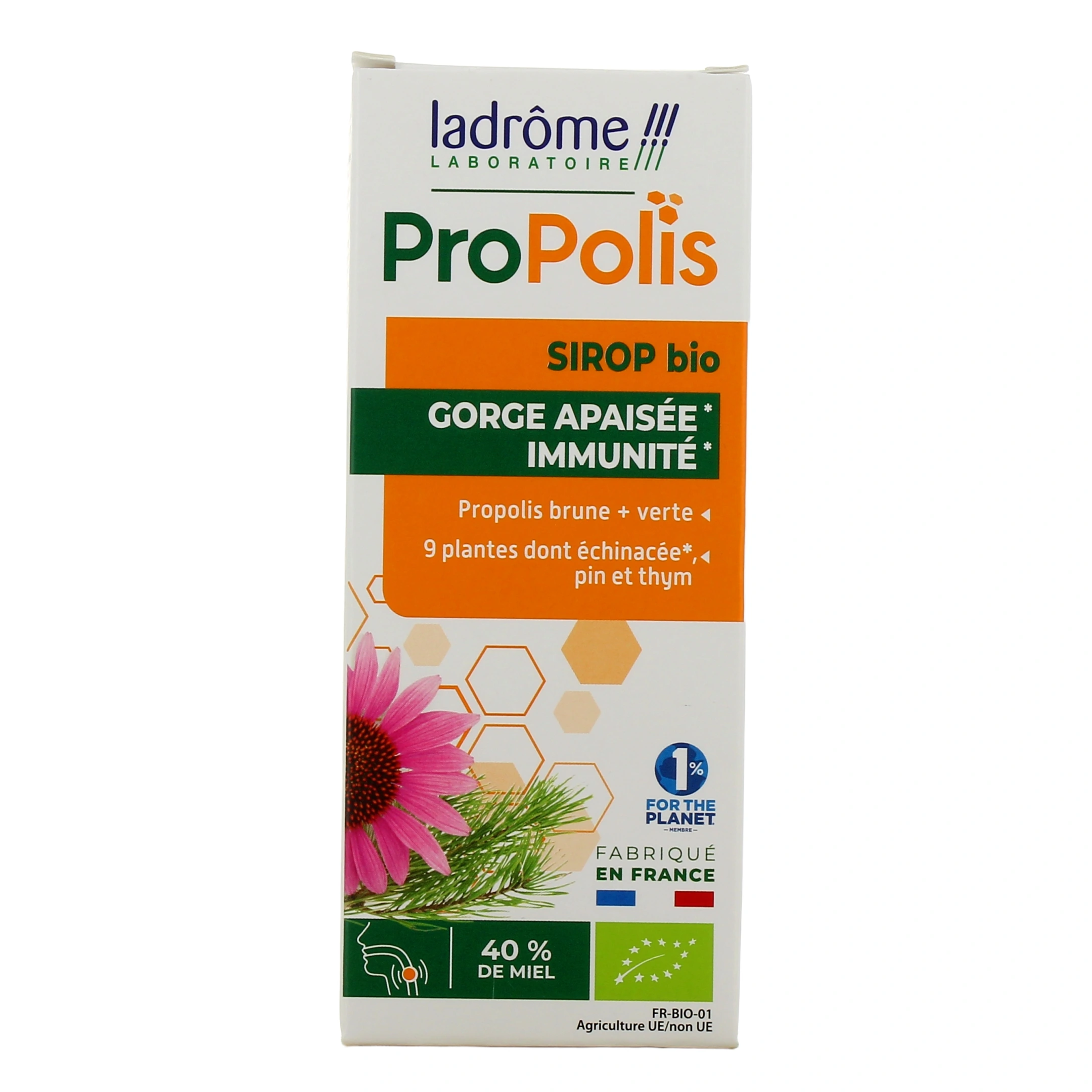 Le sirop à la propolis Ladrôme est un complément alimentaire composé de miel Bio et d'extrait de propolis Bio, et qui contribue à faciliter la respiration et à adoucir la gorge irritée.