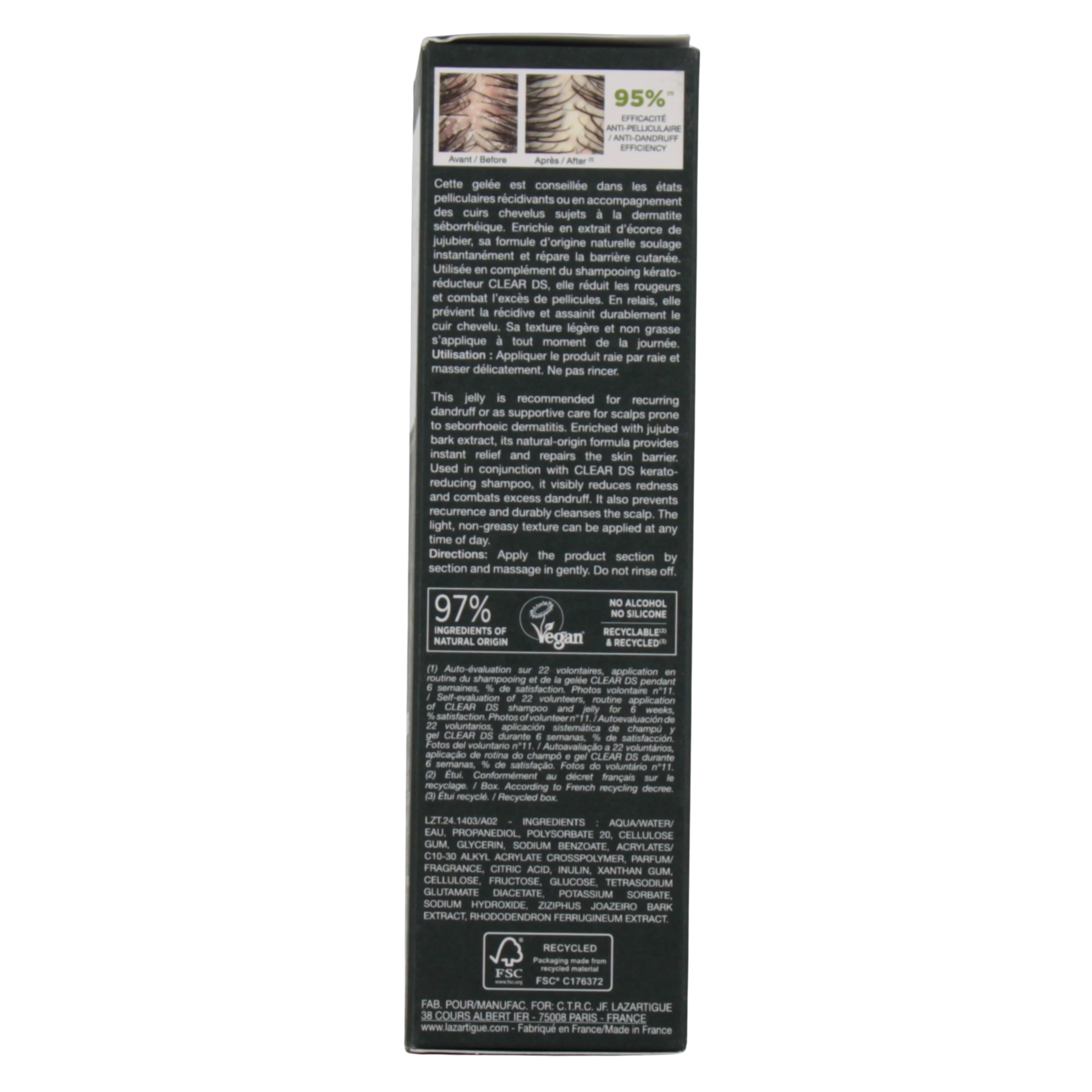 Destinée aux cuirs chevelus sensibles et sujets aux crises pelliculaires, la gelée Lazartigue Clear DS régule la desquamation intempestive ainsi que les pellicules et réduit l'excès de sébum pour permettre d'espacer et de limiter les crises de grattage intenses. Elle calme immédiatement et durablement les démangeaisons en prolongeant l'effet du shampooing de la même gamme.