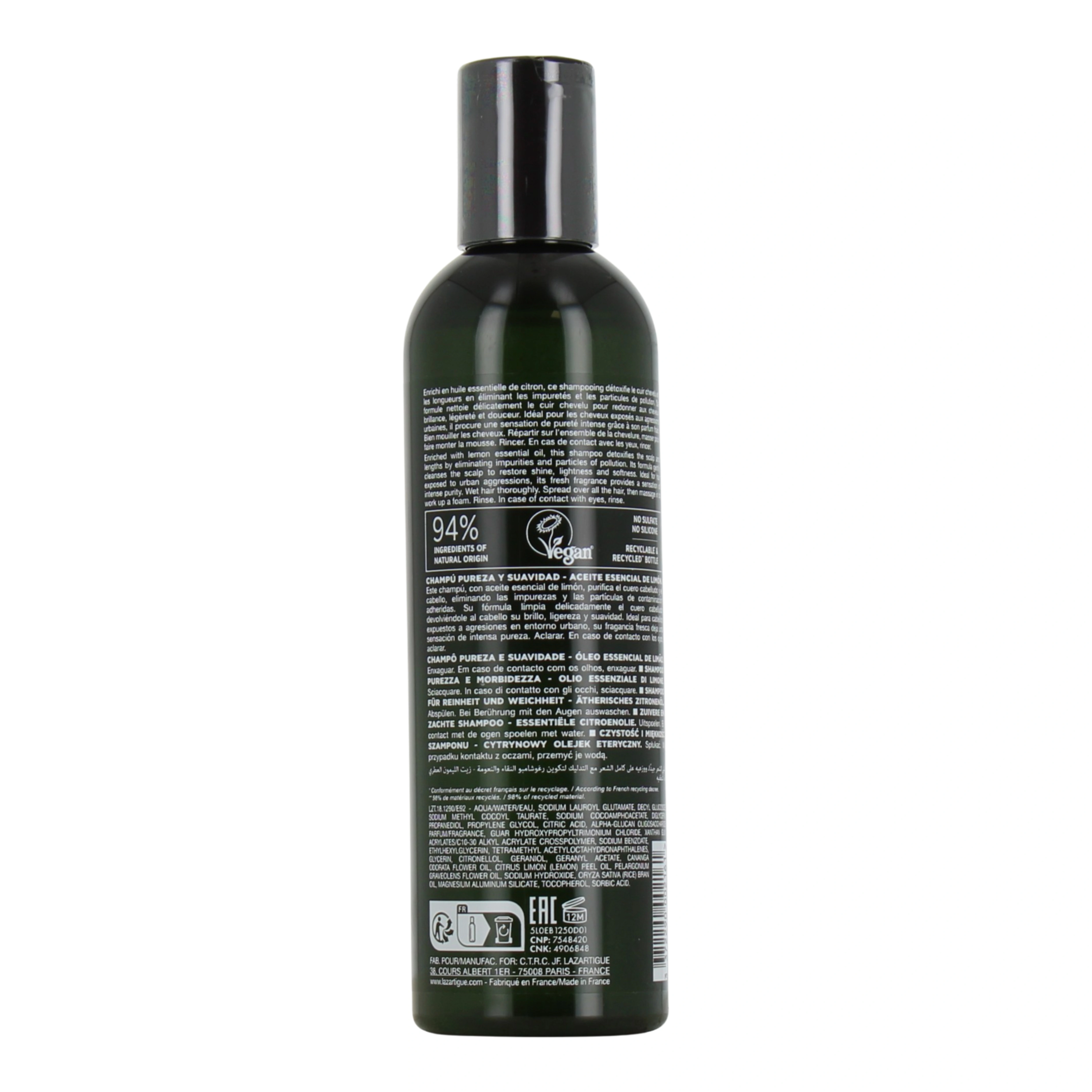 La formule de ce shampooing Lazartigue se compose notamment de lait de riz végétal aux propriétés hautement nourrissantes qui adoucit la fibre capillaire et qui donne de l'éclat à la chevelure. On retrouve également des huiles essentielles de citron aux propriétés assainissantes et tonifiantes, d'ylang-ylang pour réguler les carences et excès de sécrétion et sébum et de géranium riche en actifs purifiants et aux propriétés stimulantes. Finalement, le shampooing extra doux pureté Lazartigue renferme également Bioecolia, un prébiotique qui rééquilibre la flore cutanée du cuir chevelu.