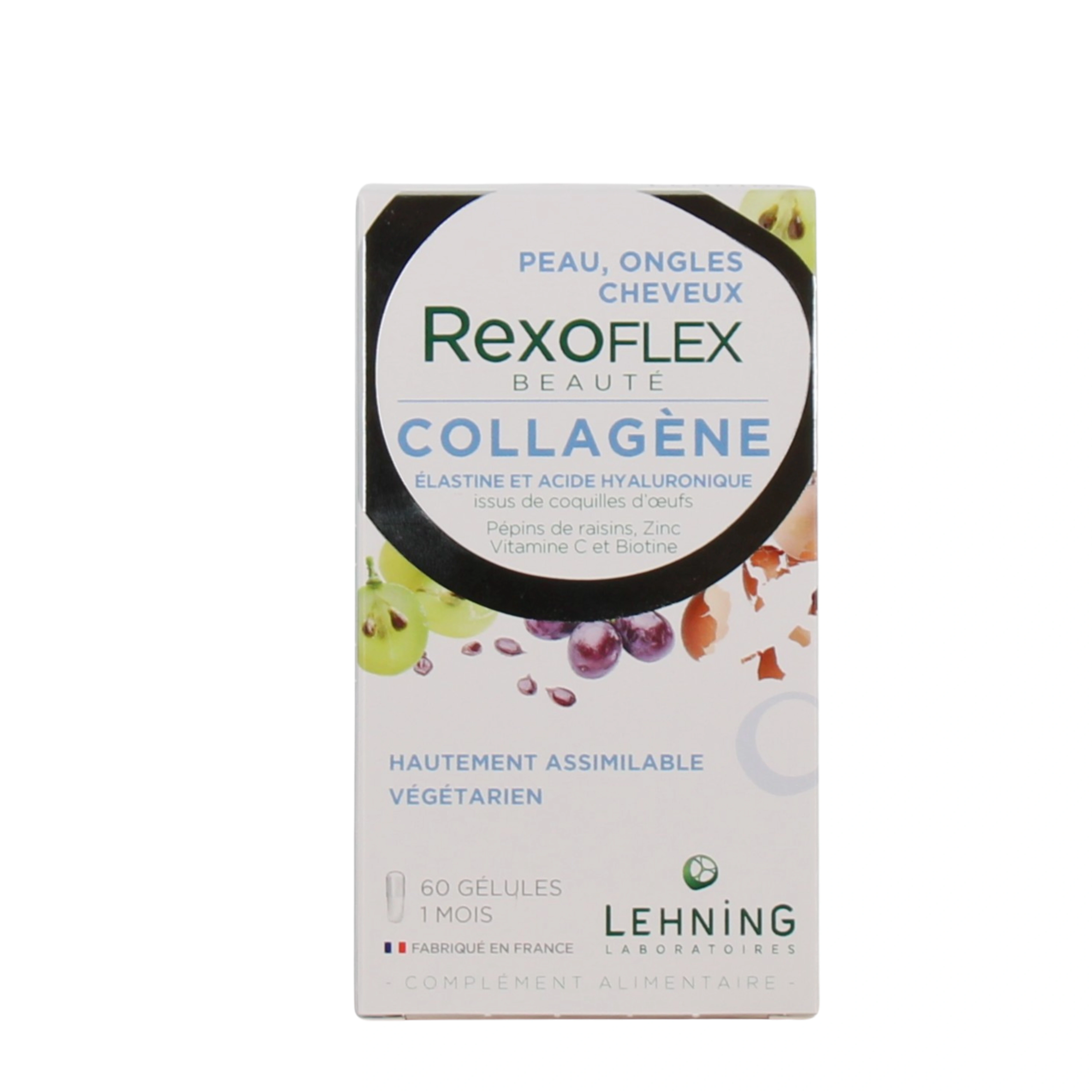 Rexoflex Beauté des Laboratoires Lehning est un complément alimentaire contenant du collagène issu de membre de coquille d'œuf de haute qualité. Il a été conçu pour améliorer la fermeté et l'élasticité de la peau ainsi que la beauté des cheveux et des ongles. Lehning Rexoflex Beauté se présente sous la forme de gélules.
