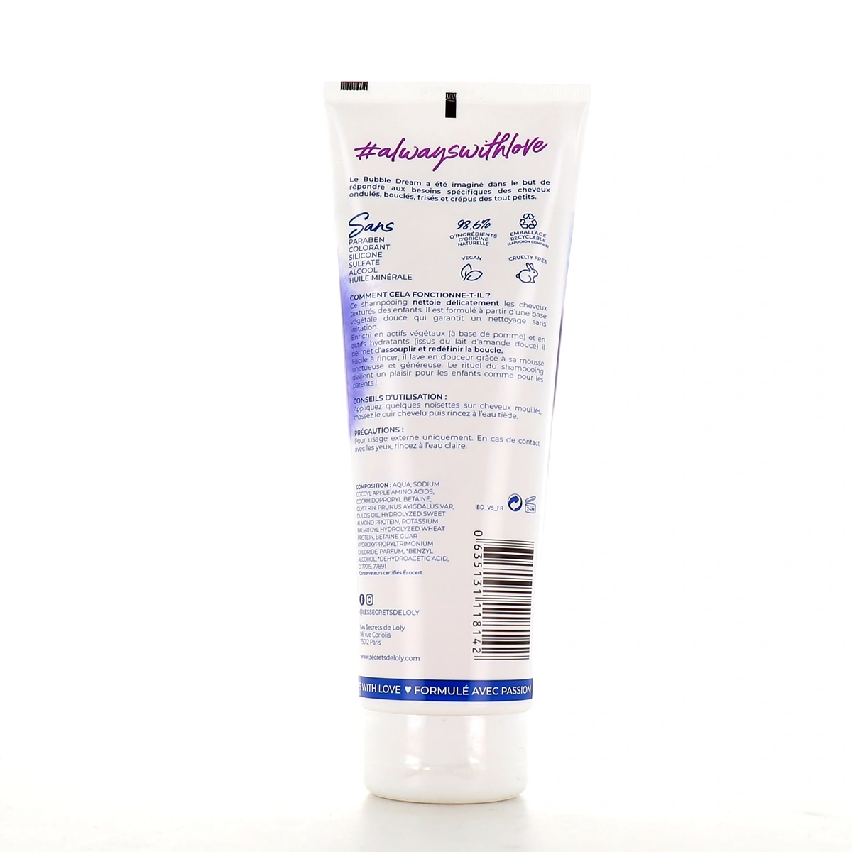 Le shampooing Bubble Dream a été conçu par la marque Les Secrets de Loly pour nettoyer en douceur les cheveux des enfants. Il convient particulièrement aux cheveux ondulés, bouclés, frisés et crépus.