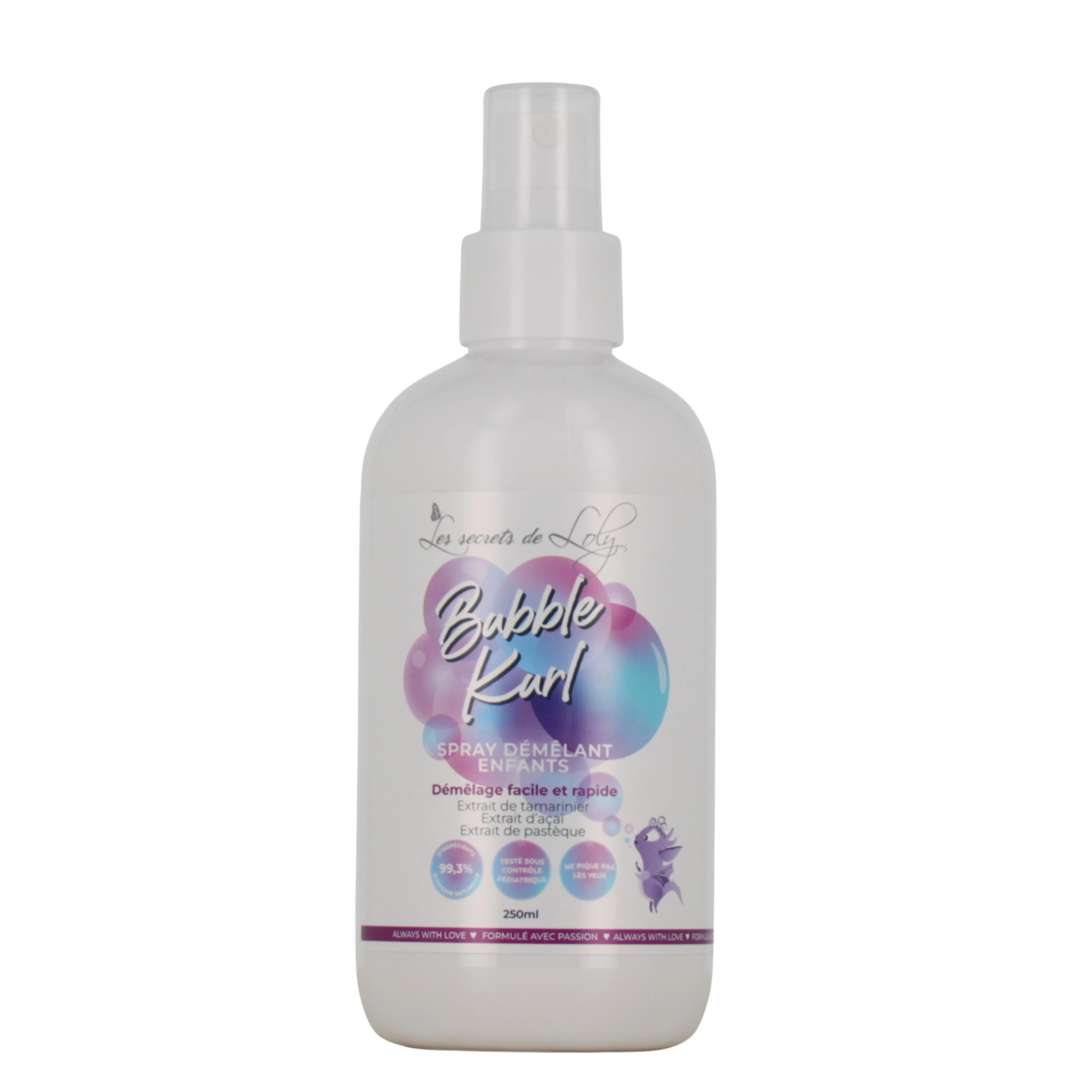 Bubble Kurl est un spray démêlant enfants formulé par Les Secrets de Loly. Il hydrate et démêle la chevelure tout en assouplissant les boucles en un seul geste pour transformer le coiffage en un instant ludique pour petits et grands.