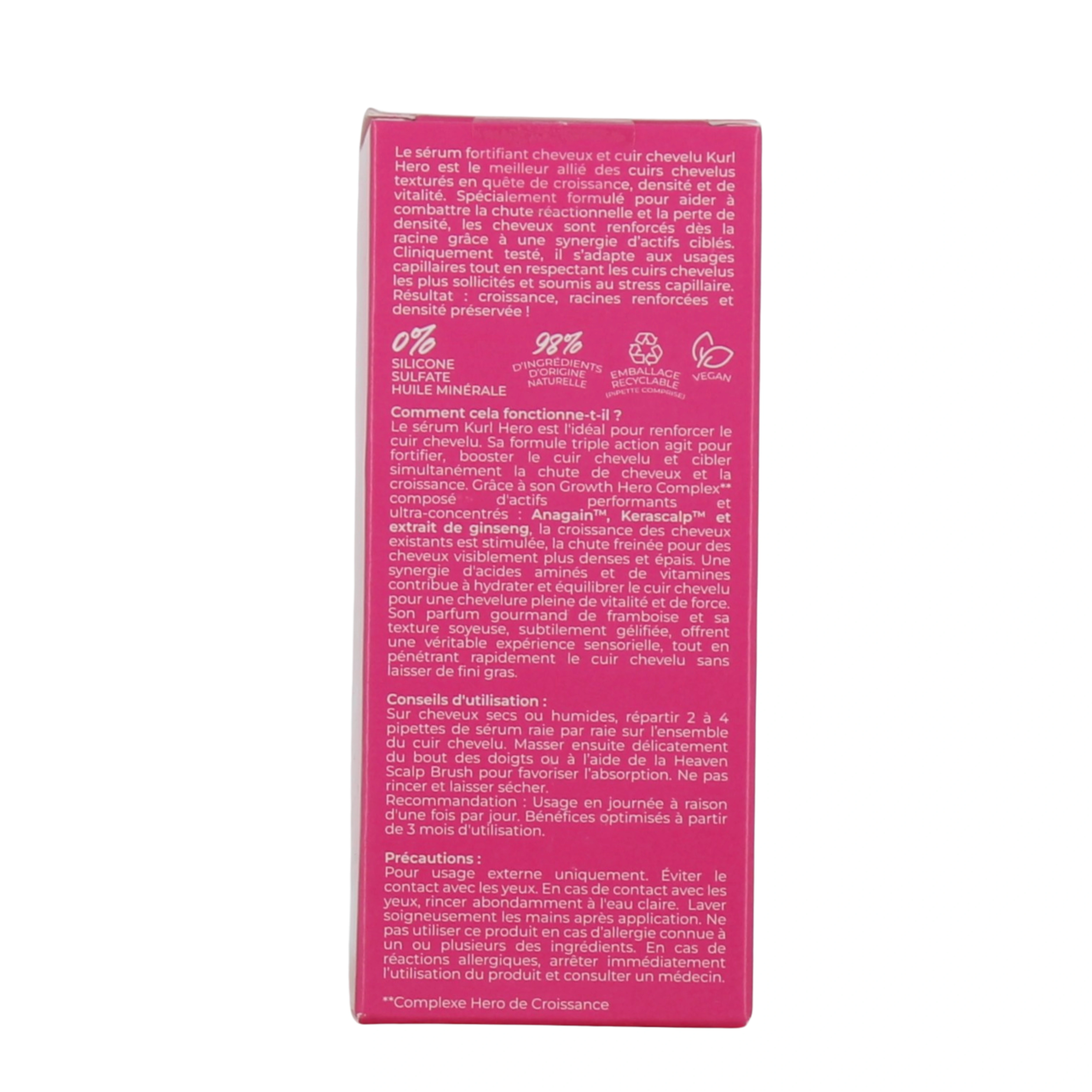 Kurl Hero est un sérum capillaire conçu par Les Secrets de Loly pour les cheveux ondulés, bouclés, frisés ou crépus. Grâce à son Growth Hero Complex à base de ginseng, de pousses de pois bio et d'amla, il stimule la croissance, renforce la densité et prévient la chute de cheveux. Cliniquement testée, la formule de ce sérum Les Secrets de Loly rend la chevelure plus forte, dense et pleine de vitalité.