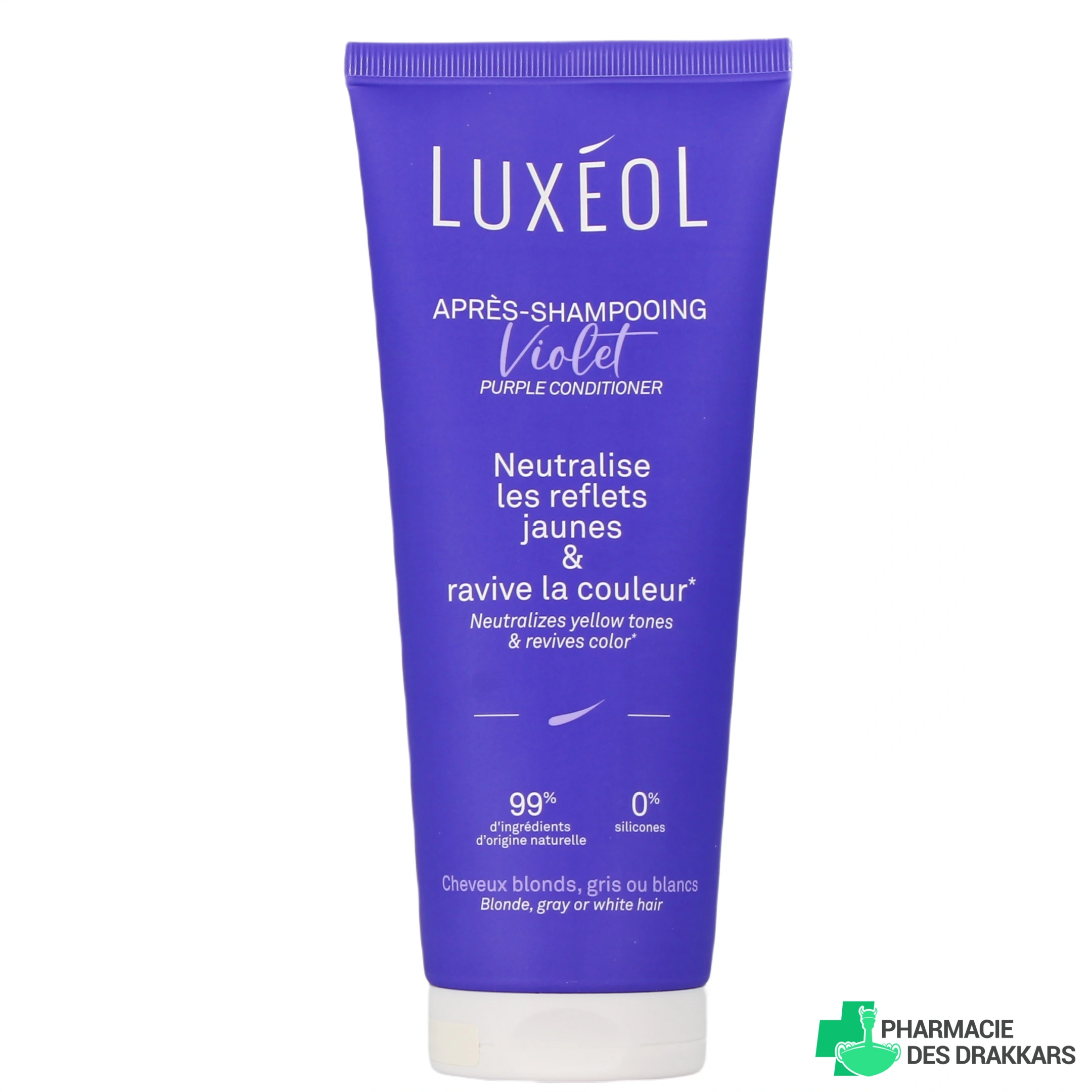 Présentation proposée sur notre pharmacie en ligne pour l'après-shampooing violet Luxéol : tube de 200 ml.