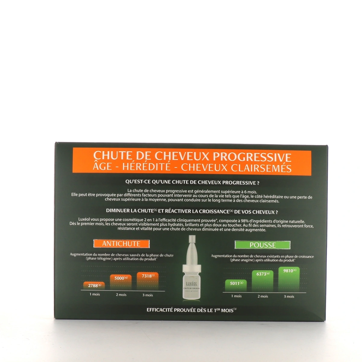 On considère que la chute de cheveux est progressive lorsqu'elle est installée depuis plus de 6 mois. La cause de cette perte de cheveux peut être héréditaire ou simplement liée au vieillissement. L'objectif du protocole Chute de Cheveux Progressive de Luxéol est de diminuer la chute et de réactiver la croissance des cheveux. Pour cela, il agit sur 3 aspects clés du cycle de renouvellement du cheveu : la phase anagène, correspondant à la croissance, la phase télogène, correspond à la chute du cheveu, et le renforcement général des cheveux.