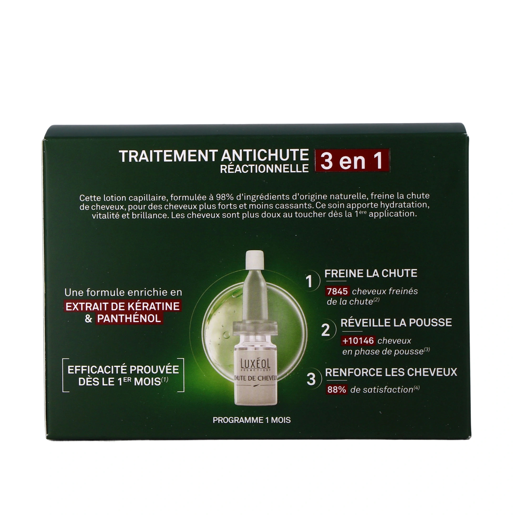 La chute de cheveux réactionnelle est une chute déclenchée par un facteur externe ou interne. Cela peut être le stress, la fatigue, un changement de saison, un régime amincissant, le post-partum ou une carence nutritionnelle. La lotion anti-chute réactionnelle Luxéol permet d'agir sur le cycle de renouvellement du cheveu, et plus précisément sur les phases anagène et télogène, respectivement liées à la croissance et à la chute. Pour cela, la formule est enrichie en kératine, une protéine naturelle représentant plus de 90 % de la structure du cheveu. Son rôle est de protéger la chevelure, prévenir la déshydratation, donner de l'élasticité et de la vigueur. En apportant une haute dose de kératine, le protocole Chute de Cheveux Réactionnelle Luxéol permet d'enrayer le phénomène de perte de cheveux et d'en prendre soin en profondeur.