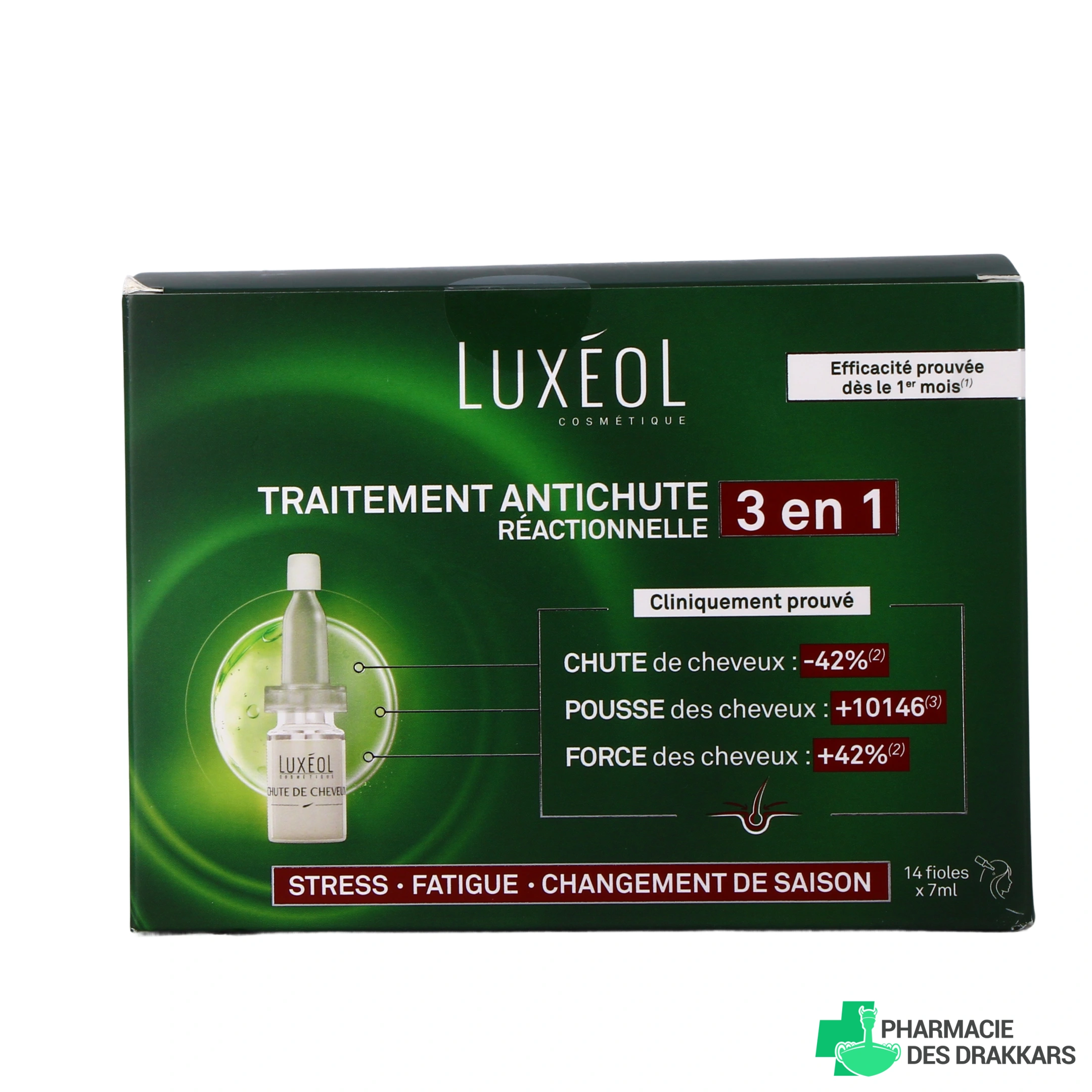 Retrouvez le protocole Chute de Cheveux Réactionnelle Luxéol sur notre pharmacie en ligne sous forme de coffret contenant 14 fioles de 7 ml, ce qui correspond à un traitement anti-chute de 1 mois.