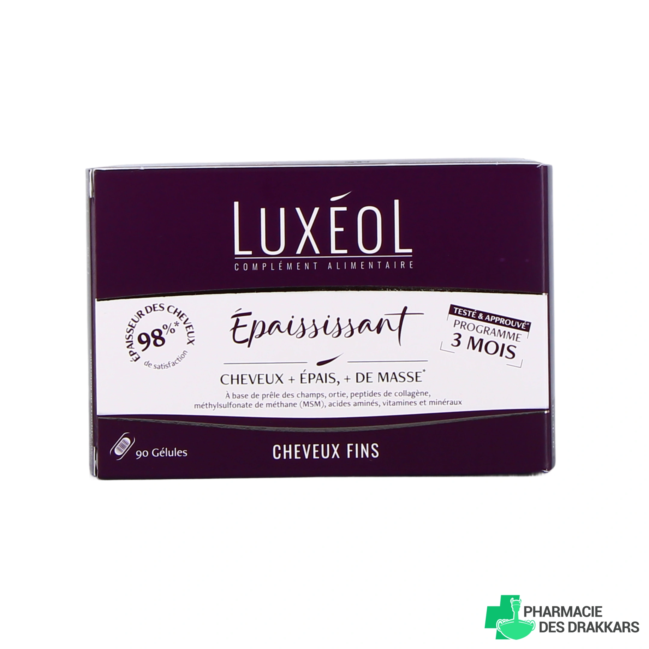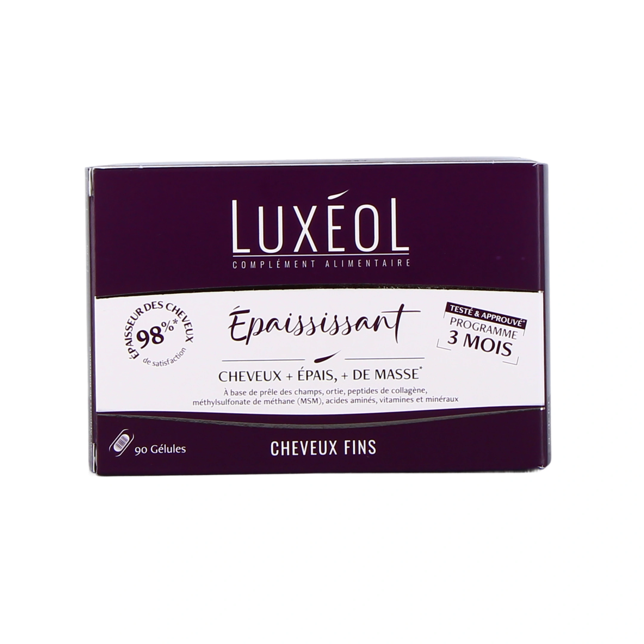 Conditionnement proposé par notre pharmacie en ligne pour Luxéol Complément Alimentaire Épaississant : boîte de 90 gélules pour un programme de 3 mois.