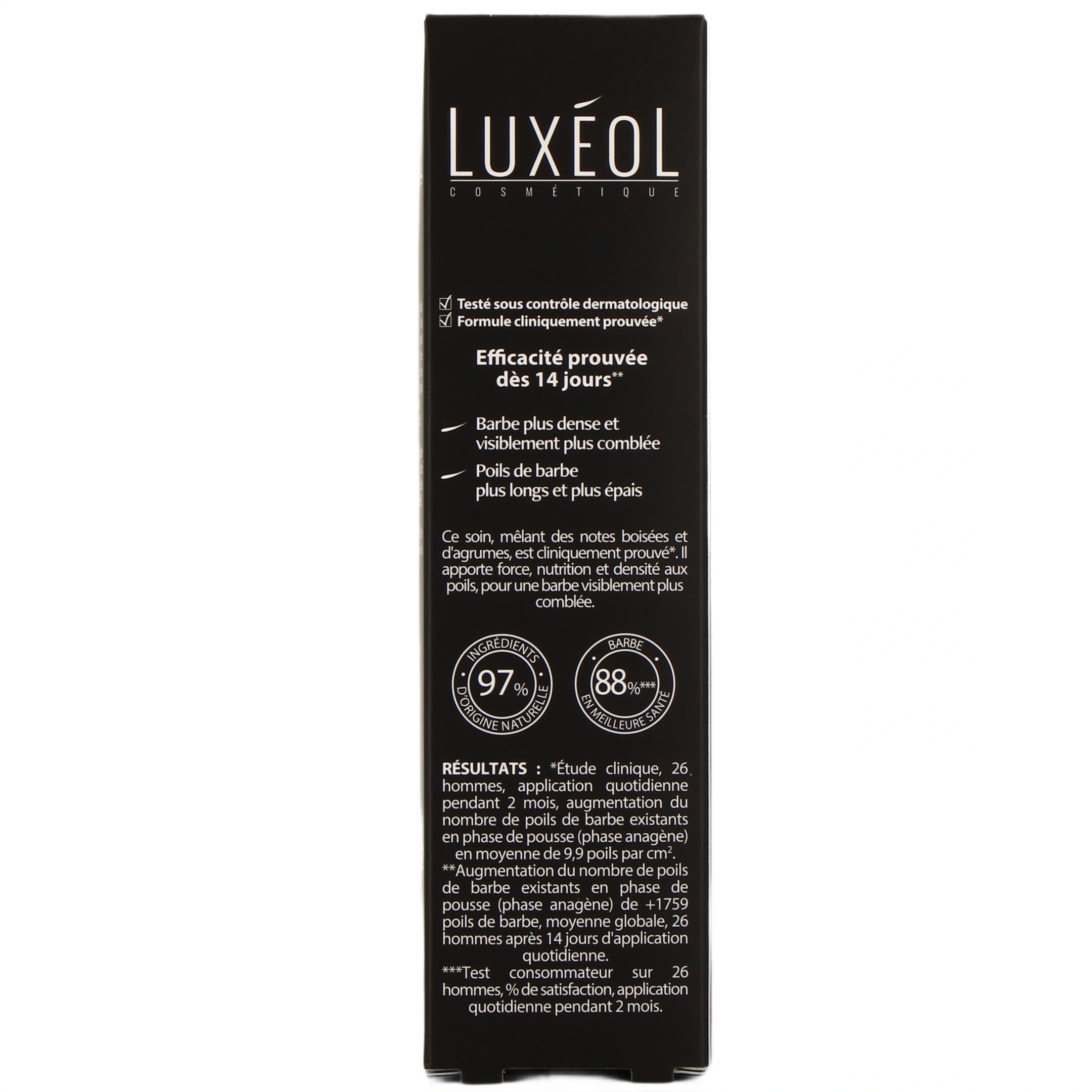 L'efficacité du sérum pour la barbe Luxéol a été cliniquement prouvée : d'après une étude menée auprès de 26 hommes ayant appliqué le sérum à raison d'une fois par jour pendant 2 semaines, l'augmentation du nombre de poils au cm² en phase anagène (de croissance) s'est élevée à environ 9,9 poils. Par ailleurs, une augmentation de l'épaisseur des poils a également été démontrée.